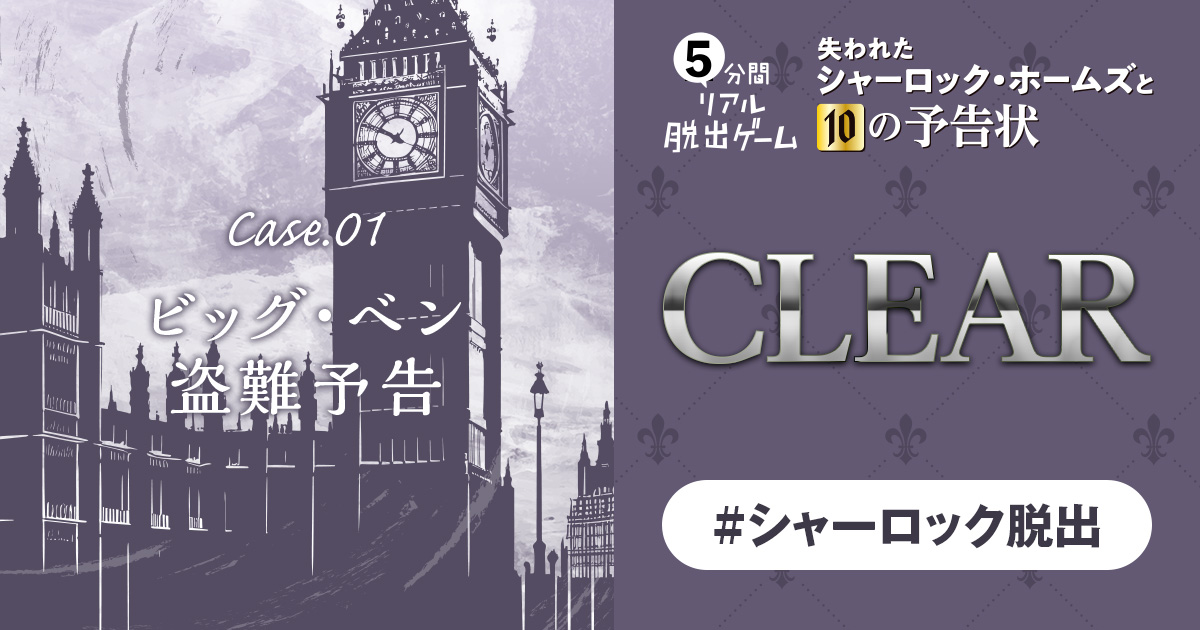 『5分間リアル脱出ゲーム 失われたシャーロック・ホームズと10の予告状』Case.01「ビッグ・ベン盗難予告」正解! 正解は「フリーズ」。 P.22のEpilogueへ進もう。 Case.01「ビッグ・ベン盗難予告」を解き明かしたことをシェアしよう! ← 解答入力ページに戻る