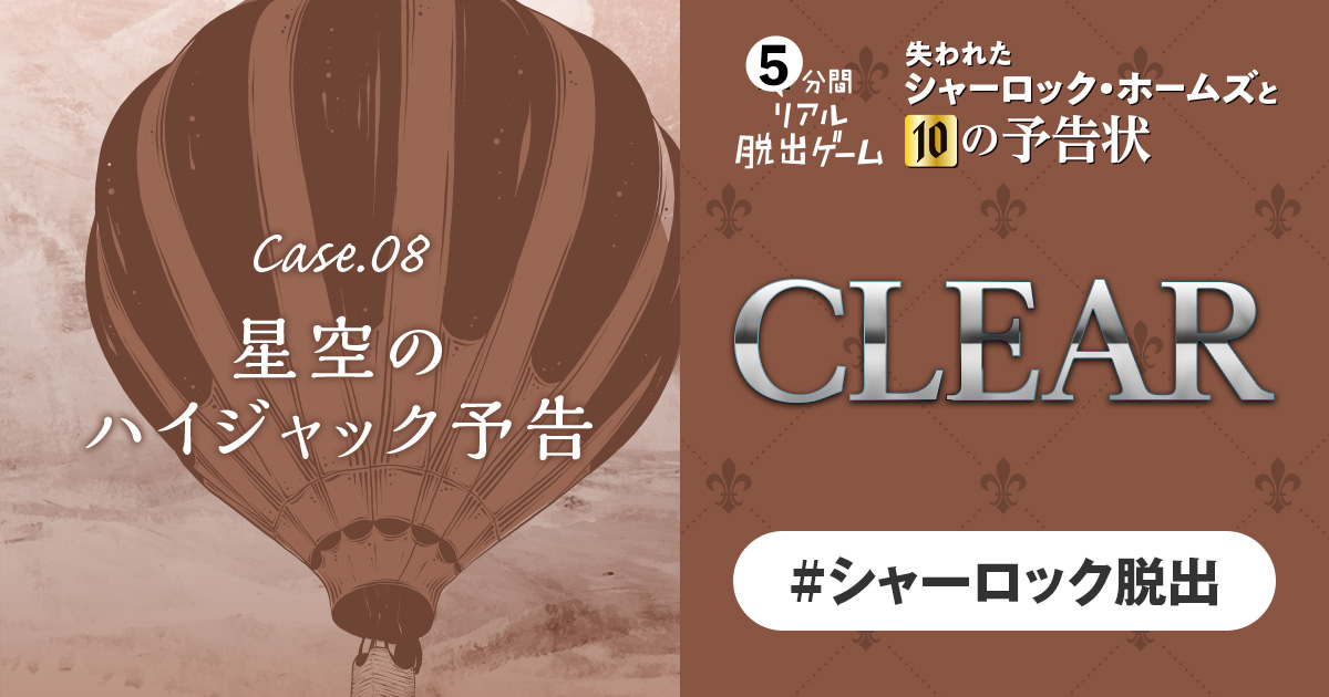 『5分間リアル脱出ゲーム 失われたシャーロック・ホームズと10の予告状』Case.08「星空のハイジャック予告」正解! 正解は「メキキ」。 P.158のEpilogueへ進もう。 Case.08「星空のハイジャック予告」を解き明かしたことをシェアしよう! ← 解答入力ページに戻る