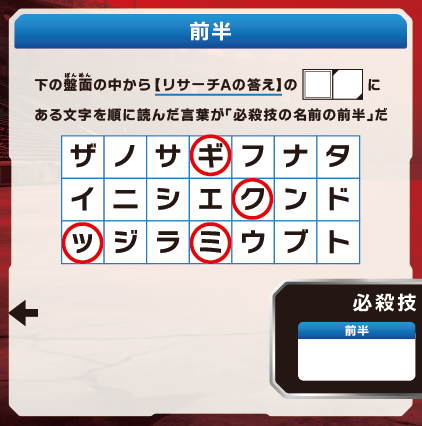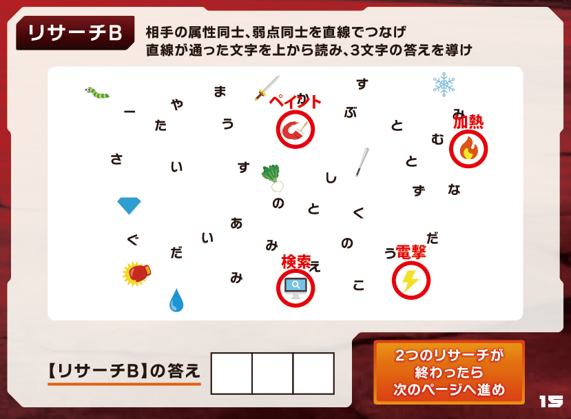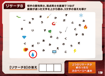盤面にある【リサーチAの答え】の「どこか」にある文字を拾う必要があります。
