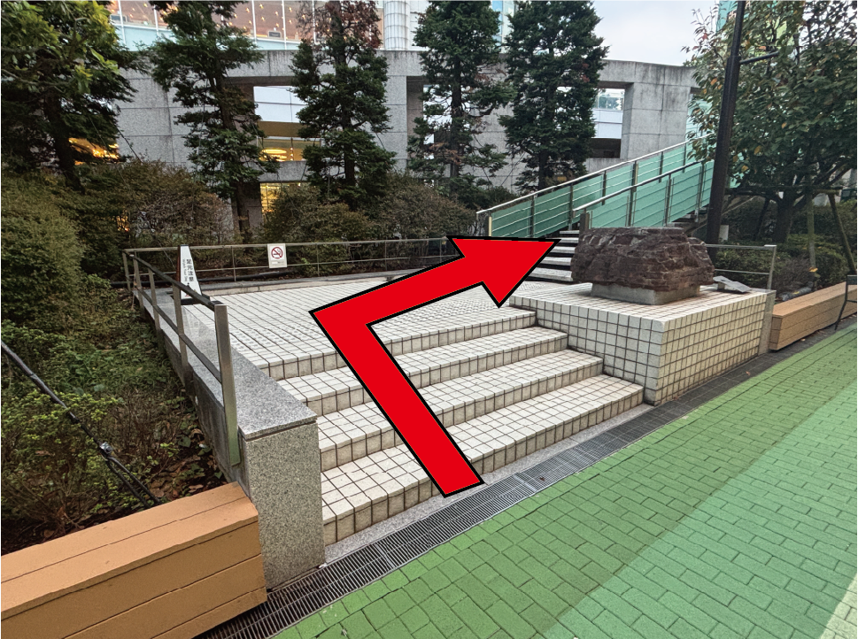 写真に写っている大きな柱の間を通って、矢印の方向へ進んでください。