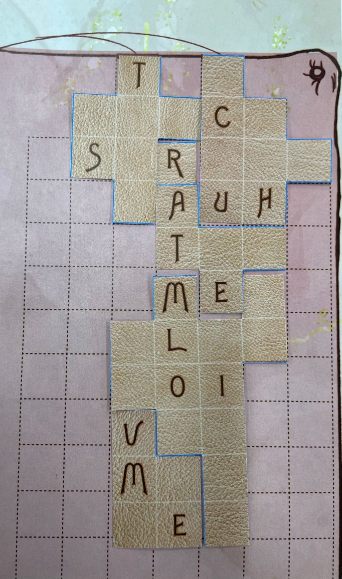 フットレストに合わせたピースをクリアファイル表紙の下に入れ込んでみましょう。答えは「TRUE LOVE」になります。