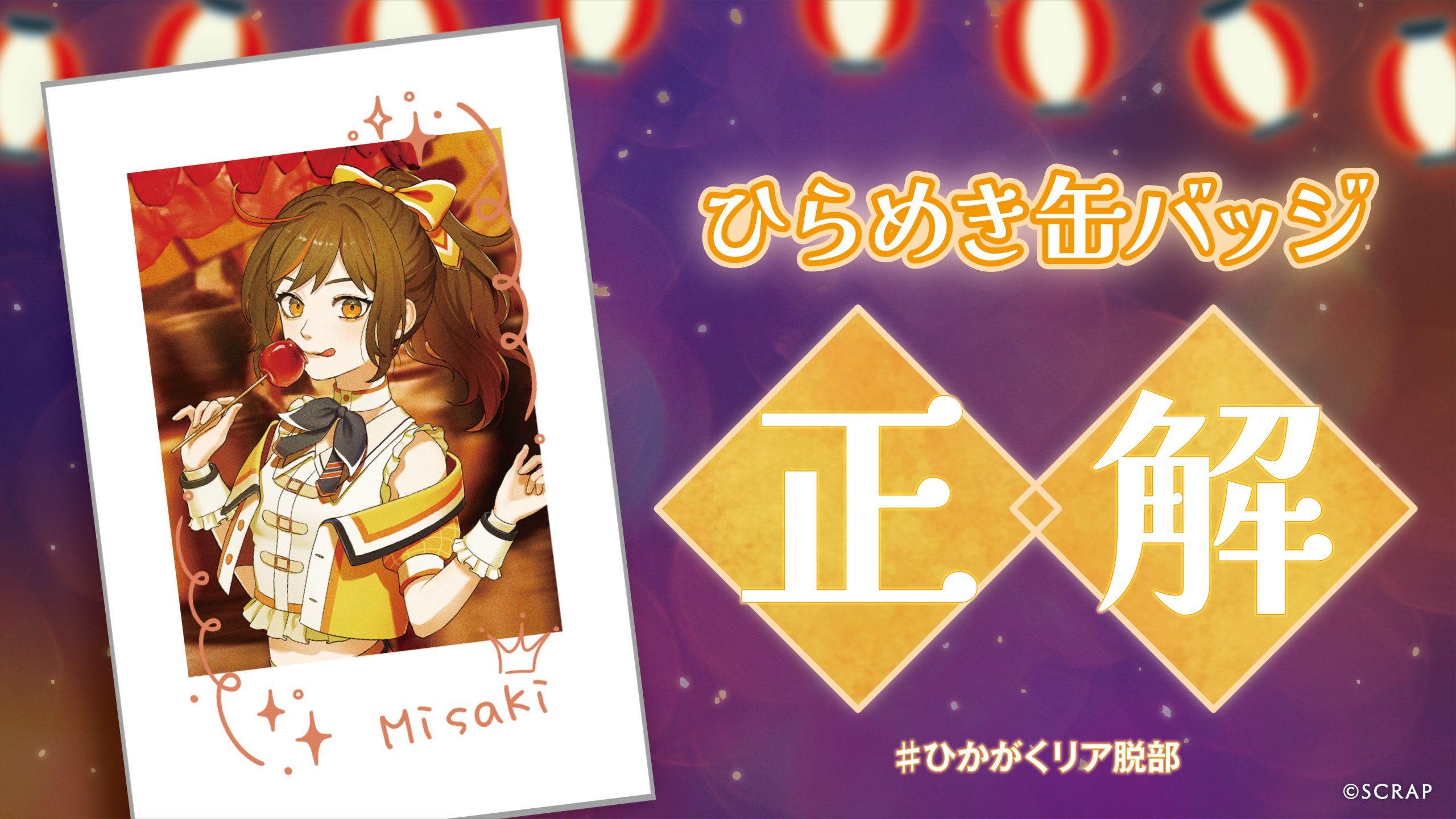 時が交差する夏祭りからの脱出 ひらめき缶バッジ(海咲ver.) 正解 私の謎の答えは「TRUE」でした〜!! 真実を見抜いたそのチカラ、これからもバッチリ発揮してくださいねー!!!(海咲) おめでとう!正解したことをシェアしよう!