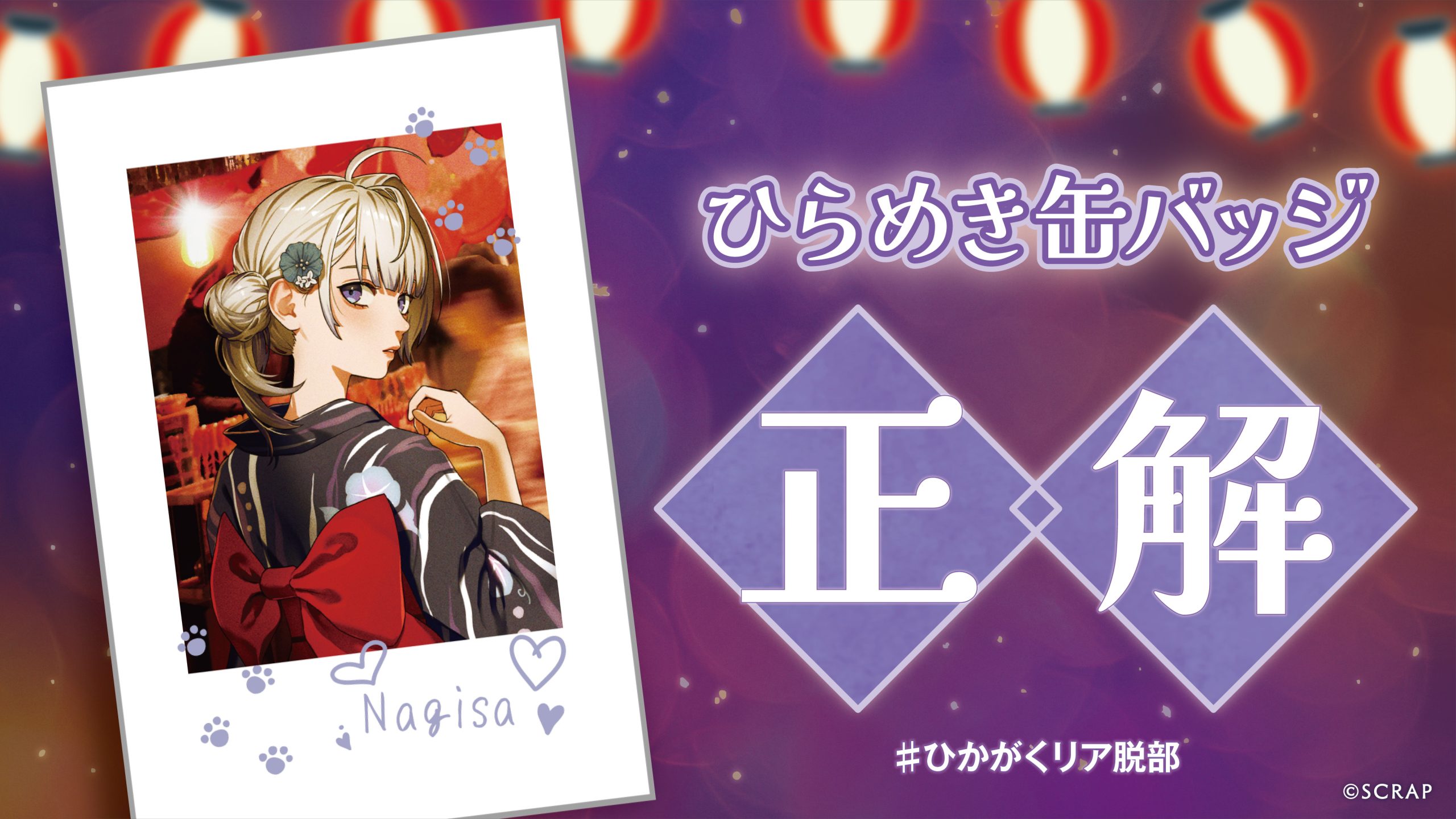時が交差する夏祭りからの脱出 ひらめき缶バッジ(渚ver.) 正解 私の謎の答えは「ひらめき」でした! またひかがくリア脱部の謎で、みなさんのひらめきを見せてくださいね!(渚) おめでとう!正解したことをシェアしよう!