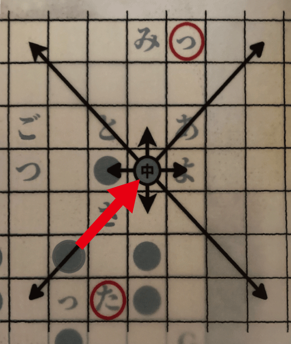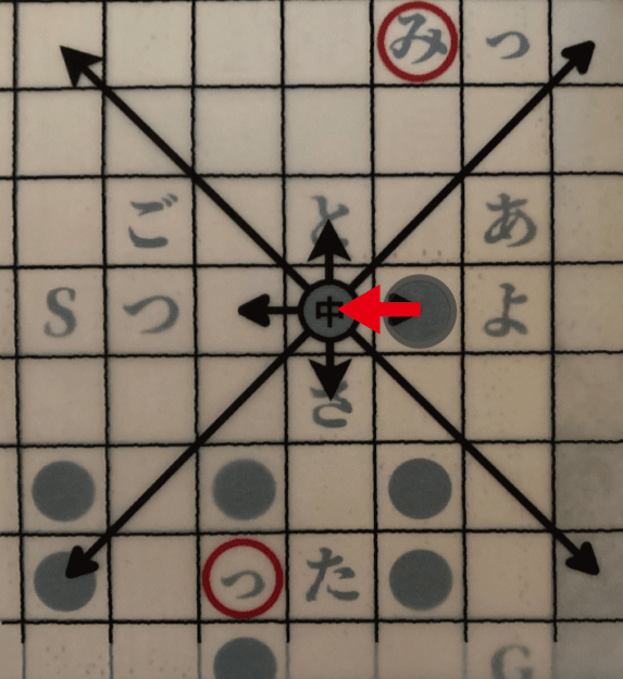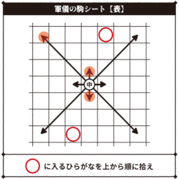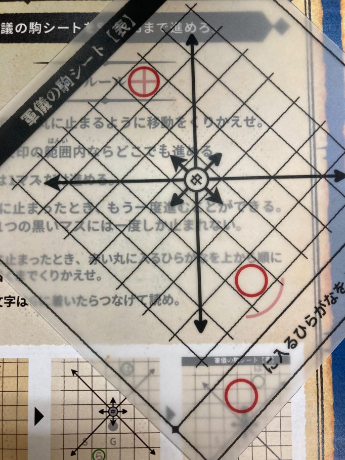 とがっている矢印がすべての誤字を指すように、軍儀の駒シートを置いてみよう。