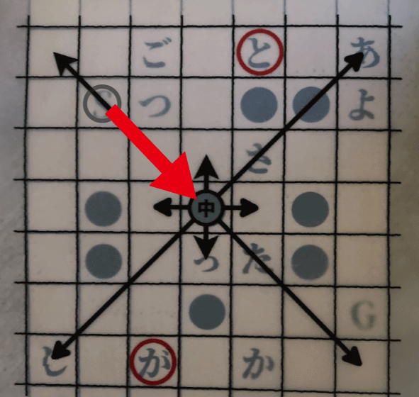 黒いマスに駒を進めると、赤い丸の中に「と」と「が」が入る。