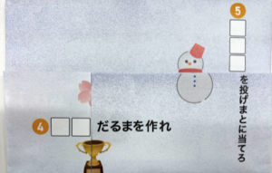 ゆきだるまを作るとその右に「ボールを投げまとに当てろ」という指示がでています。