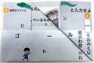 サクラのかけらを探し、画像のように紙を折ってサクラのイラストを完成させましょう。