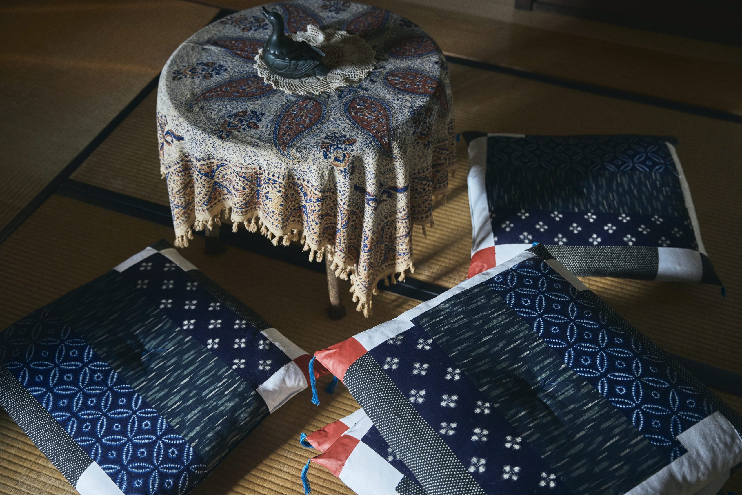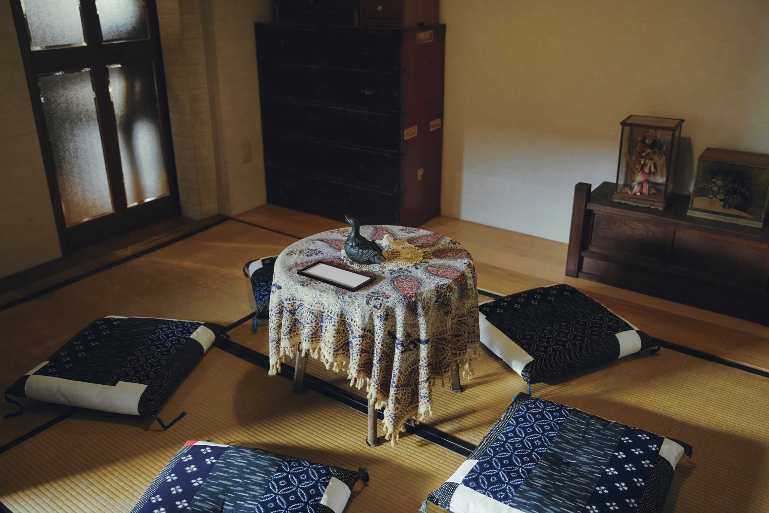 謎の館からの脱出 解説付きクリアファイル_幸子の部屋 制作秘話 -幸子の部屋の謎- 館で最初に出会う部屋なので、まずは探索の謎と、館らしいアイテムで解ける謎に。ふかふかの座布団は1枚6,000円の高級品!(コンテンツ制作:福原) 制作秘話 -幸子の部屋の成り立ち- 幸子の部屋は玄関から入ってすぐの場所にあり、以前は待合室としても使われていたため、座布団がたくさん置かれています。(コンテンツ制作:福原) ◀︎リビング 一覧へ戻る 応接間▶︎