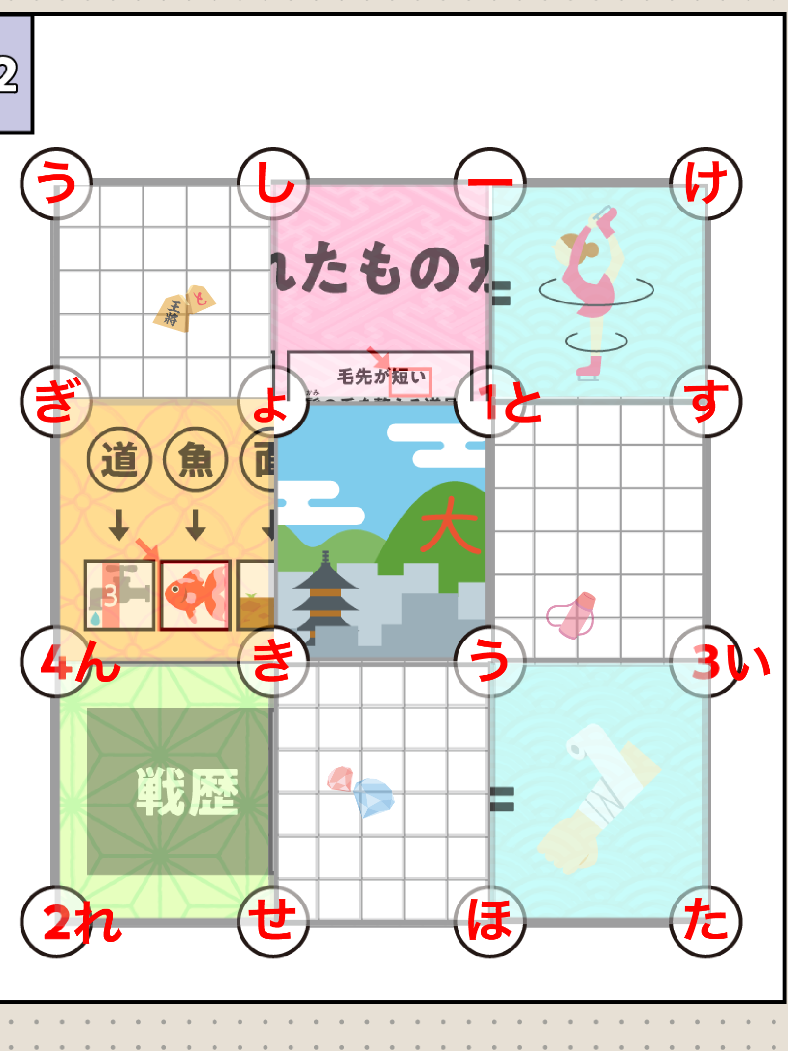 もちのイラストがあるため、上段の真ん中のマスには「ち」を、下段の真ん中のマスには「も」を入れましょう。