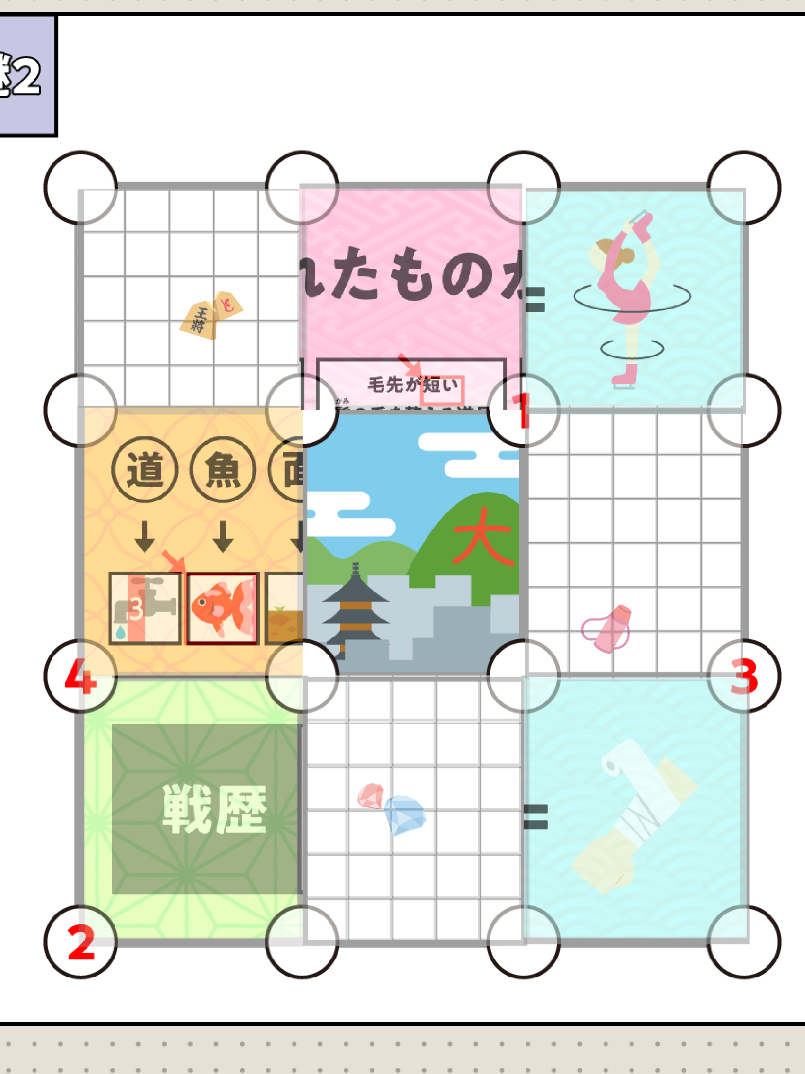 左から2番目のイラストは「金魚」、左から4番目のイラストは「火山」であることから、2文字目の漢字は真上の漢字になります。1文字目の漢字に関する法則も見つけましょう。