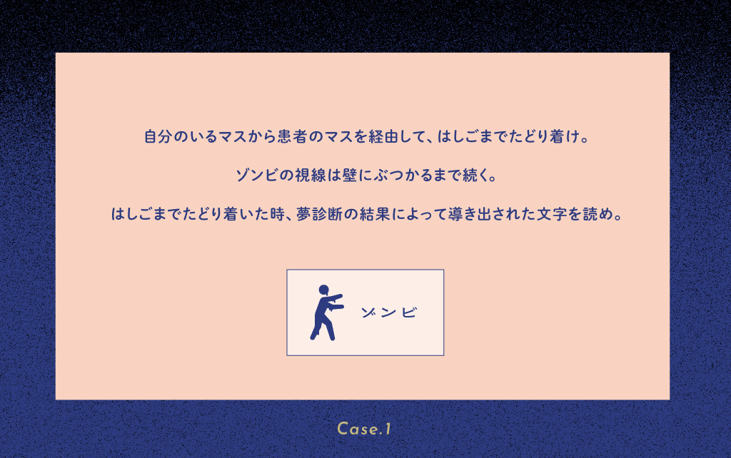 まずはルールに従って、ゾンビの視線の先を特定し、通れるマスを明らかにしましょう。