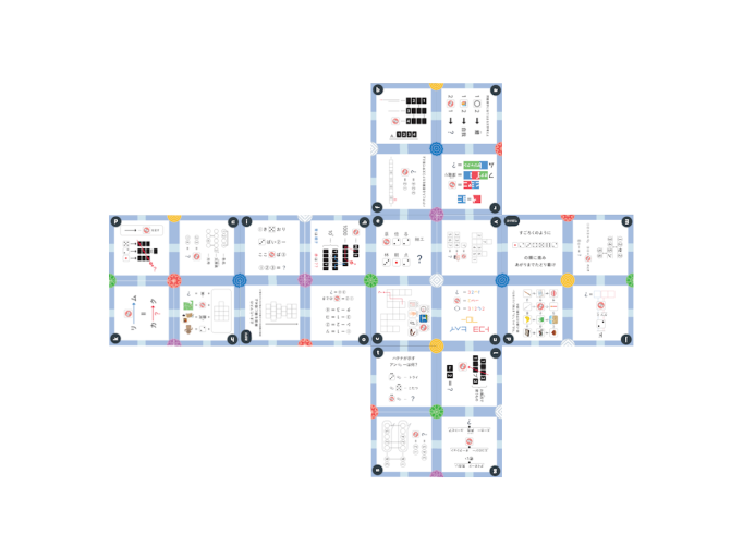 まずは4つの謎用紙を使い、中心に円が1つ、各辺に半円が1つずつあるような2×2のかたまりを作ってみましょう。これを繰り返すことで6つのかたまりを作ることができそうです。