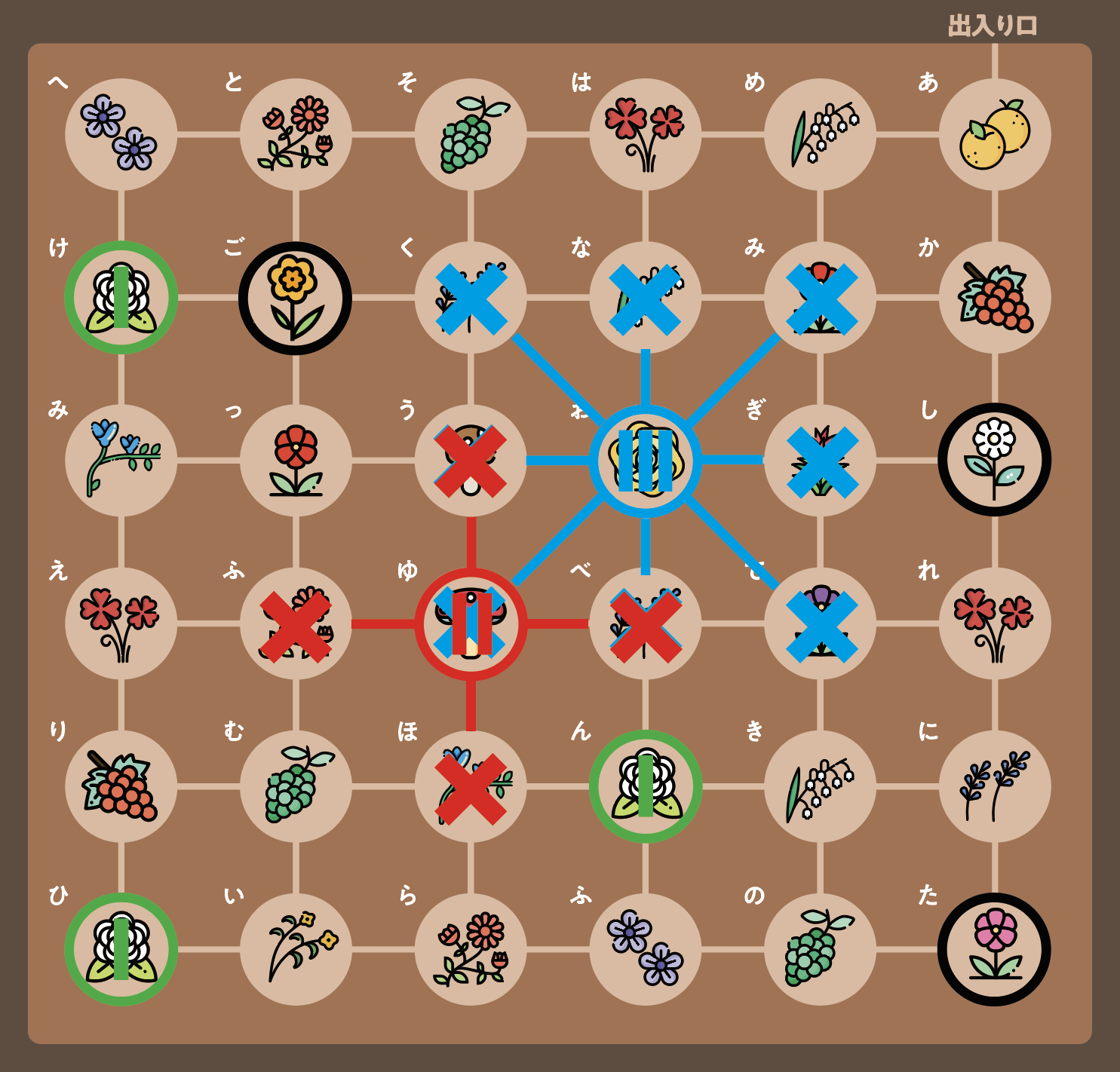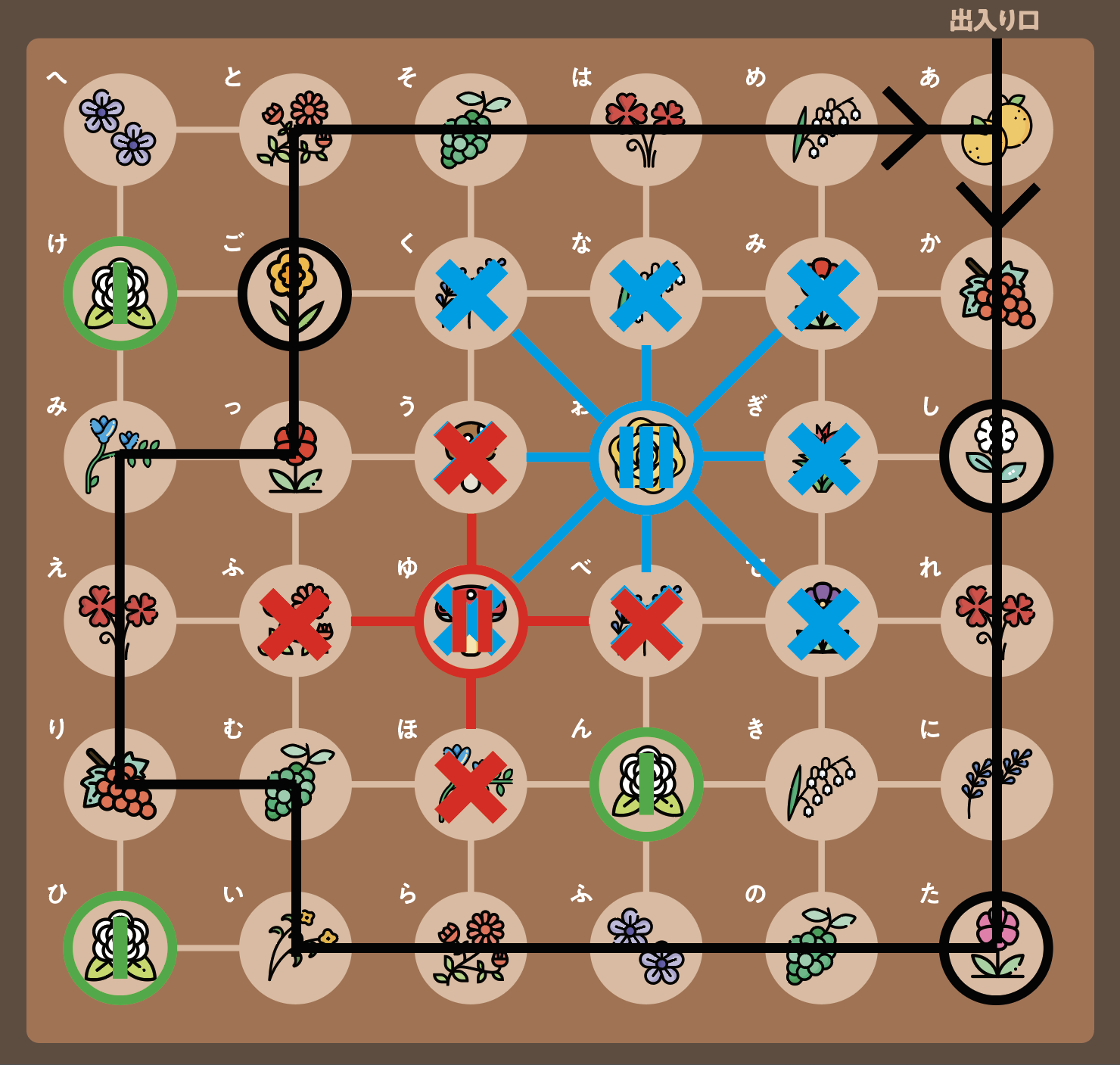 マレーザの香りが漂っていて通れないマスに✕をつけてみると、以下のようになる。