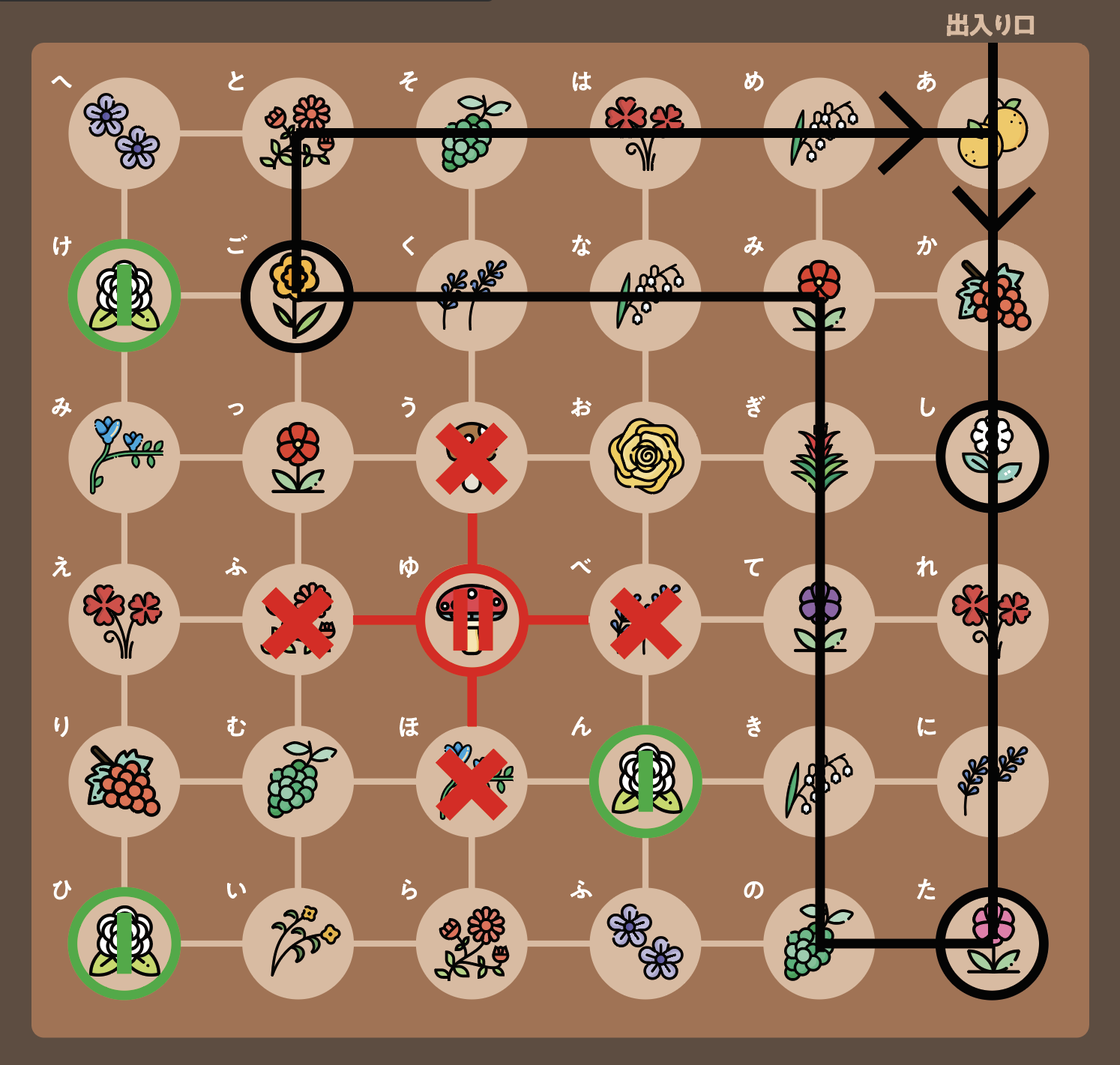 摘むべき植物の場所は「し」「た」「ご」のマスにある。