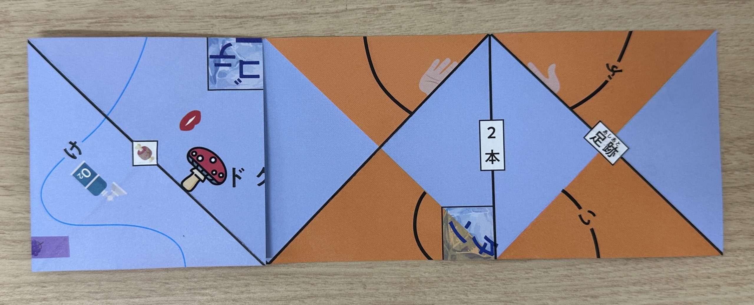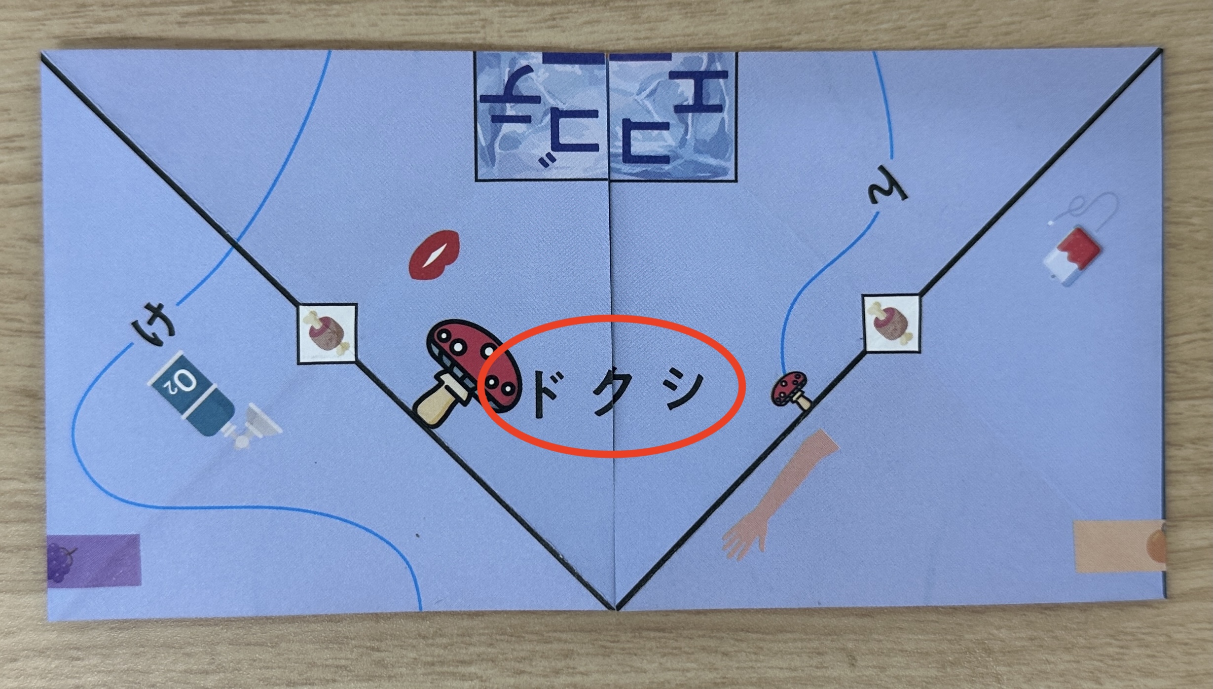 脳内シートで、該当する単語が書かれた線を順番に谷折りしていくと、キノコの間に「ドクシ(毒死)」という単語ができあがる。