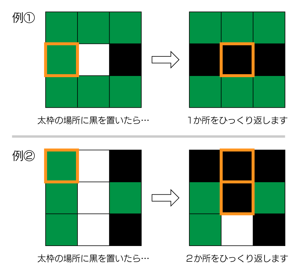 ②そのとき、自分のコマで相手のコマを縦横ナナメのどこかで挟んだら、その間にある相手のコマをすべてひっくり返すことができます。