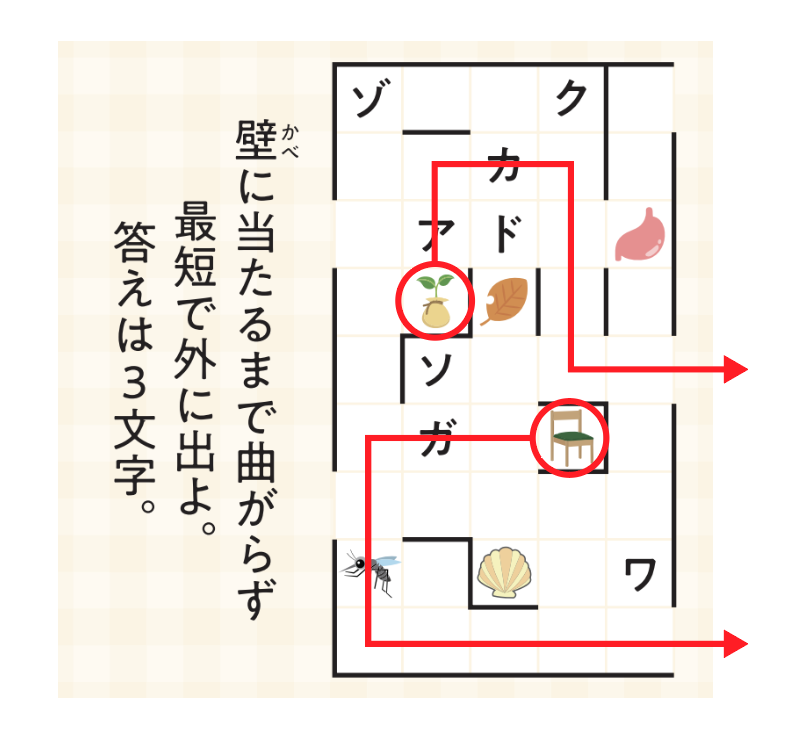 「チェア」からのルートは「ガ」と「蚊のイラスト」を通っています。