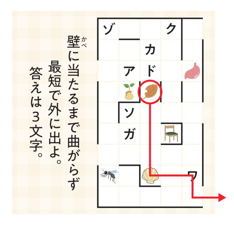 「苗」「チェア」「枯れ葉」のイラストからそれぞれ最短で迷路の外に出ましょう。