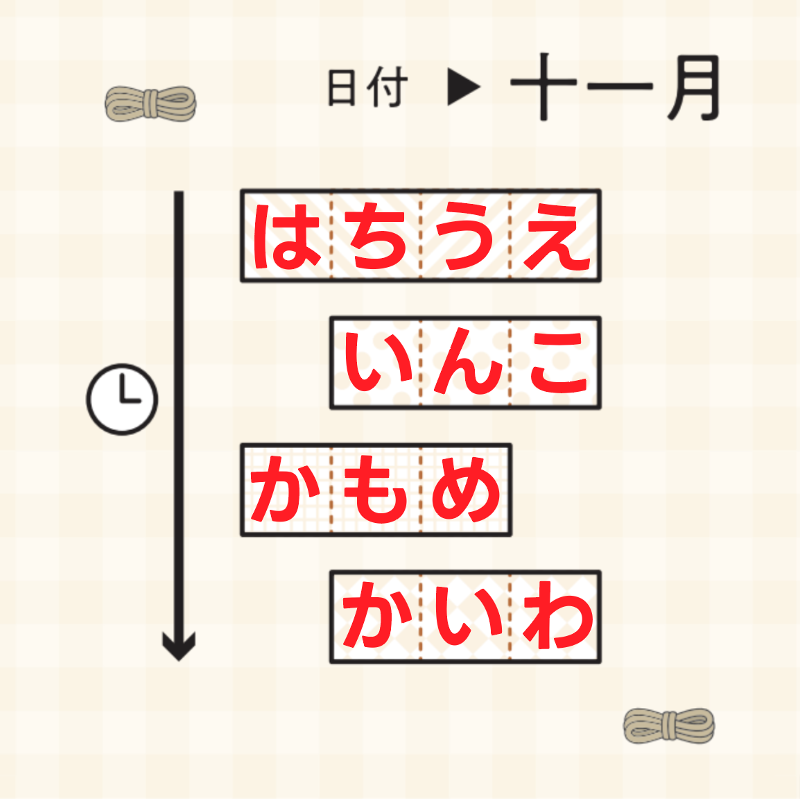 「ふつか」「ヒモノ」「アイダ」「ヨメ」から「ひのふだ あついよ」の文字を取り除きましょう。