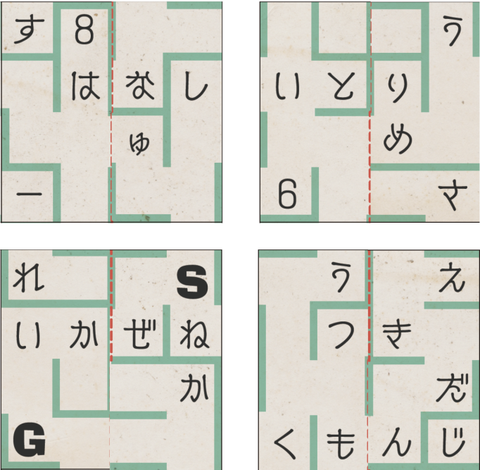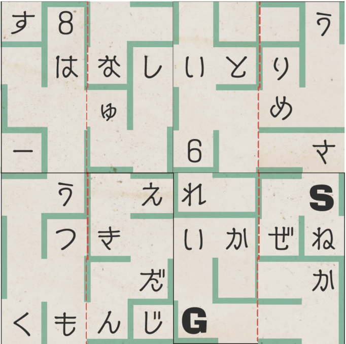 MAZE-MAZE RIDDLE-STEP3 かな9文字の言葉: ※ひらがなで入力してください まず何をすれば良いかわからない まずは8枚の迷路の欠片にある赤い点線を切りましょう。 その後、2枚の紙を折らずに、切り込みの部分に迷路の欠片を差し込むように組み合わせます。 このとき、迷路の面の真ん中の上側に「はな」「とり」「かぜ」「つき」の2文字ずつが並ぶ迷路の欠片が4つ作れるように、適切な組み合わせを探しましょう。 さらにヒント 組み合わせると、このような迷路の欠片が作れます。 さらにヒント 2枚の紙を組み合わせたことで、迷路の欠片の謎が書かれた面の左半分と右半分同士が合わさり、新たな4問の謎が完成します。 この状態で、もう一度迷路の欠片の謎を解き直しましょう。 謎1 中華 花粉 ライスと書かれた謎 さらにヒント 各行に書かれたすべての単語の最初の文字のみを抜き出しましょう。 一番上は、「力(ちから)」、真ん中は「口(くち)」となります。 答え うす 謎2 BLOCK… と書かれた謎 さらにヒント アルファベットの「O(オー)」のある場所に異なるアルファベット1文字を入れることで、右のイラストを表す英単語を作れます。 上から順に「BLACK」「CUT」「STEP」と当てはめましょう。 その後、「BLOCK」の「O」の部分に入る文字は「A」、のように、上から文字を拾いましょう。 答え エース 謎3 トマト→ひ と書かれた謎 さらにヒント 2枚の迷路の欠片が合わさったことで、線でつなぐ対象が「トマト→火→マッチ」に変化しています。 線でつないで通った文字を順に読みましょう。 答え ウィナー 謎4 4×4の盤面の謎 さらにヒント 矢印には、「盤面の点対称の位置にある文字に変換する」法則があります。 盤面の「かざん」の点対称の位置にある文字を読みましょう。 答え ふくつ 4問の謎が解けた後 「迷路の欠片の配置のしかた」に従って、再び答えを導いた4枚の迷路の欠片を2×2に配置しましょう。 さらにヒント 左上に「エース」、右上に「うす」、左下に「ウィナー」、右下に「ふくつ」が答えの謎を配置することで、「迷路の欠片の配置のしかた」にある条件をすべて満たした状態で迷路の欠片を配置することができます。 配置が完了したら、迷路の欠片をそれぞれ横に裏返すことで、新たな迷路が完成します。 答え 迷路の欠片を指示に従い横に裏返すと、このような迷路が完成します。 完成した迷路からかな9文字の単語が導けない 迷路の欠片が2枚組み合わさっていることで、迷路の形も変化しています。 Sから上に進み、反時計周りに進むようにGまで向かいましょう。その際、2枚が重なったことで見えていない部分の迷路を辿る必要はありません。 答え さいしゅうもんだい