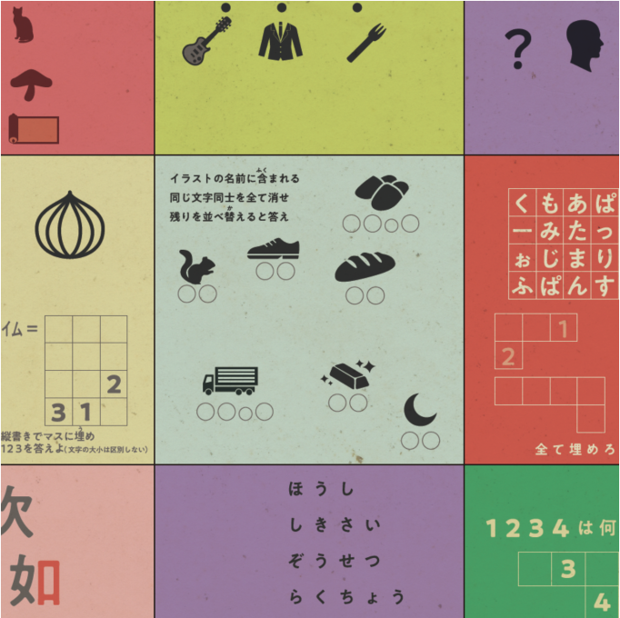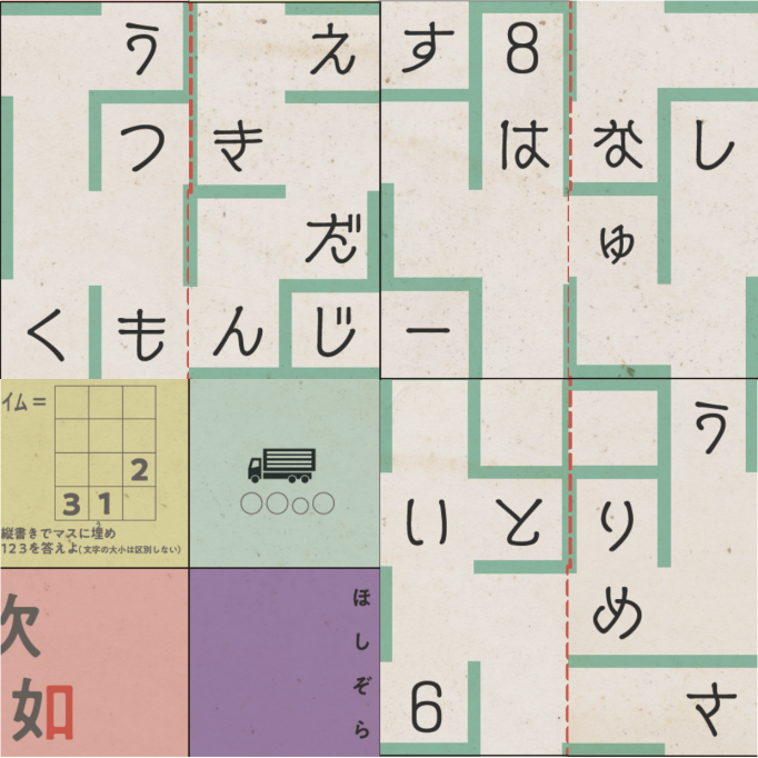 MAZE-MAZE RIDDLE-LAST STEP かな5文字の言葉: ※ひらがなで入力してください まず何をすれば良いかわからない まずは謎を解き、新たなMAZE-MAZE BOARDを入手するための指示文を導きましょう。 「花」「鳥」「風」「月」のイラストはすべて、STEP3で組み合わせた状態の迷路の欠片1枚と対応しています。 謎の書かれた面に注目することで、指示文が導けます。 指示文が導けない 鳥:黒と白の間 迷路の面で「とり」を作った迷路の欠片の謎の面に注目しましょう。 漢字の「黒」と左下の指示文中の「しろ」の間にある単語が答えです。 鳥:黒と白の間の答え 話 風:法の下 迷路の面で「かぜ」を作った迷路の欠片の謎の面に注目しましょう。 右上の問題文中にある、「法」の下にある3文字が答えです。 風:法の下の答え 山折り 鳥:小文字の下 迷路の面で「とり」を作った迷路の欠片の謎の面に注目しましょう。 「小文字」は、「迷路の欠片の配置のしかた」で、「っ、ぃ、ゃ」などを意味していました。 「チョコ」の「ョ」が小文字に該当するため、その下にある漢字1文字が答えです。 鳥:小文字の下の答え 道 月:ひとことの間 迷路の面で「つき」を作った迷路の欠片の謎の面に注目しましょう。 「ひとこと」を「ひ」と「こと」と解釈し、「火」のイラストと「琴」のイラストの間の文字を読みましょう。 月:ひとことの間の答え 点線 花:黒四角と階段の間 迷路の面で「はな」を作った迷路の欠片の謎の面に注目しましょう。 黒四角のイラストと階段のイラストの間には、とある動作を表すイラストがあります。 花:黒四角と階段の間の答え 切る 完成した指示文を確認する 「話」を山折りし、「道」を山折りした後、点線を切る 出てきた指示への従い方がわからない 導いた指示をMAZE-MAZE BOARDの裏面で実行する必要があります。 最初に山折りすべき「話」は、背景にある、右上から左下に引かれた対角線に注目してみましょう。 すると、「話」を意味する「STORY」の5文字を通っていることがわかるため、この線を山折りしましょう。 さらにヒント 次は、同じように「道」を山折りします。 背景に引かれた線に、「道」を意味する「ROAD」の4文字を通る線があるため、その線を山折りしましょう。 さらにヒント 最後に、点線部分をハサミで切り取ります。 紙を広げると、MAZE-MAZE BOARDの中心で切り取られたような紙があるはずです。 答え 指示に従うと、MAZE-MAZE BOARDがこのように切り取られます。 入手したMAZE-MAZE BOARDの使い方がわからない 「MAZE-MAZE BOARDの使い方」に沿って、STEP3で配置した状態と同じ状態で、迷路の欠片を新たに入手したMAZE-MAZE BOARDの上に配置しましょう。 その後、一番右下にある「S」と「G」が書かれた迷路の欠片を取り除きます。 さらにヒント 迷路の欠片が置かれていない、右下の部分にのみ注目しましょう。 元々MAZE-MAZE BOARDに書かれていた4つの謎の1/4同士が合わさったような状態になっているはずです。 さらにヒント 実は、このように4つの謎の1/4同士が合わさったような状態でも、1つの謎として答えを導くことができるようになっています。 実際に解いてみましょう。 MAZE-MAZE BOARDの謎が解けない すべて埋めろ と書かれた謎 ブロックとして使ったマス目と五十音表の左上が切り取られたマス目にに、「つき」「きん」「うし」「きさい」「うせつ」「くちょう」の6つの単語をスケルトンパズルの要領で埋めることができます。 まずは、唯一4文字である「くちょう」を中央のブロックに横に埋めましょう。 すべて埋めたら、1234に入る文字を順に拾いましょう。 すべて埋めろ と書かれた謎の答え いんせき (「宇宙」のため、謎の上にある迷路の欠片を下に1マススライドする) 4×4の盤面の謎 盤面の中に、周囲にあるイラストの名前である「ふぉーく」「あたま」「すりっぱ」「ぱん」が縦横に隠れています。それらをすべて消すと、残りの文字が1つの単語になっているはずです。 4×4の盤面の謎の答え もみじ (「植物」のため、謎の左にある迷路の欠片を右に1マススライドする) 同じ文字をすべて消す謎 イラストの名前は「ねこ」「きのこ」「まきもの」「すーつ」「ぎたー」「たまねぎ」「りす」「くつ」です。 これらの文字から、同じ文字同士をすべて消しましょう。 同じ文字をすべて消す謎の答え くもり (「天気」のため、謎の下にある迷路の欠片を上に1マススライドする) 縦書きでマス目に埋める謎 マス目の周りには、「トラック」のイラストと「欠如(けつじょ)」の文字、「ほしぞら」の文字があります。 MAZE-MAZE BOARDが切り取られたことで、上段に埋めるべき文字が「仏(ほとけ)」に変化していることに注意しながら、これら3つの単語を埋めてみましょう。 縦書きでマス目に埋める謎の答え くじら (「海」のため、この状態でSからGまで迷路を辿る) 混ぜ終わった迷路の状態を確認する 指示通り混ぜると、このような迷路が完成します。 完成した迷路からかな5文字の単語が導けない 「S」と「G」が書か