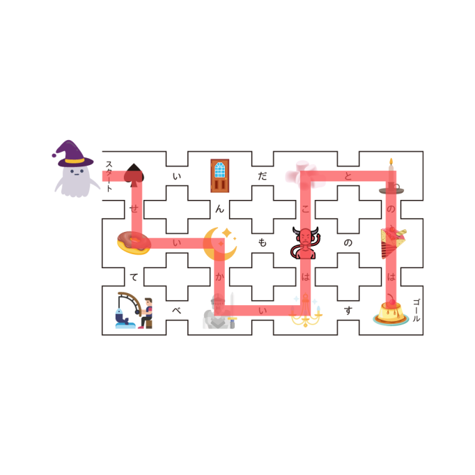 実線の矢印が通っているイラストは「どくろ」「こうもり」「ふくろう」「ごーすと」だ。