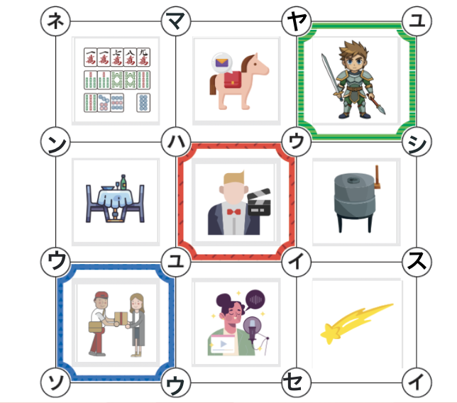 パズルの結果から、赤/緑/青の枠には、順に俳優/勇者/郵送が入ることがわかる。さらに、これらを囲むように3種類の枠が登場している。これらの枠に見覚えはないだろうか