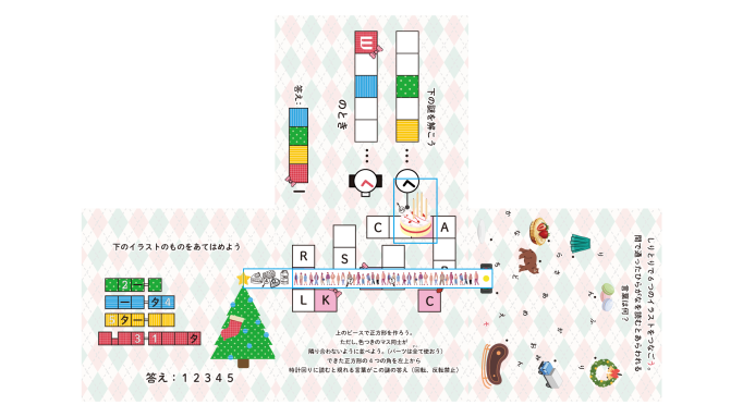 「そして、出来上がったプレゼントボックスの中の、シールに書かれた矢印が指し示す先の1文字を読もう。マス目の中の文字は読まなくてもいいぞ。文字を並び替えてできたものこそが、ミユの本当の願いだ。」