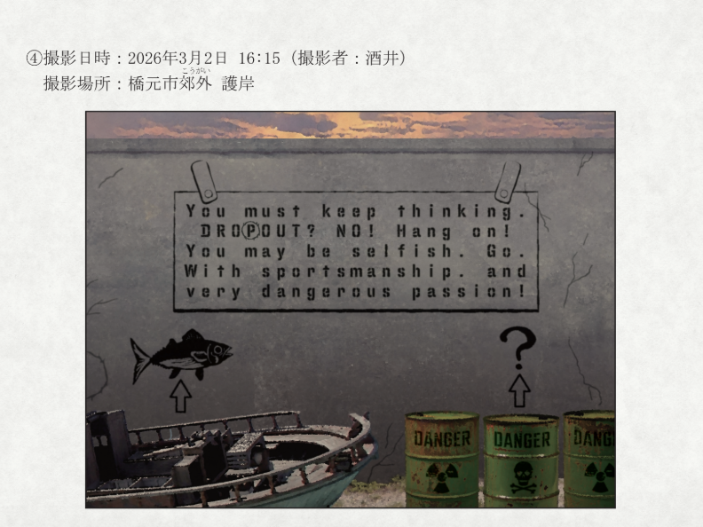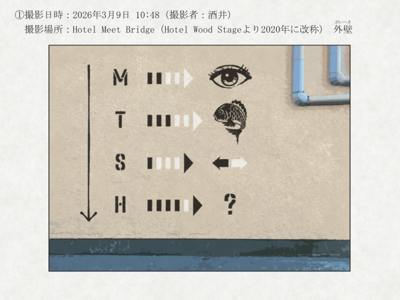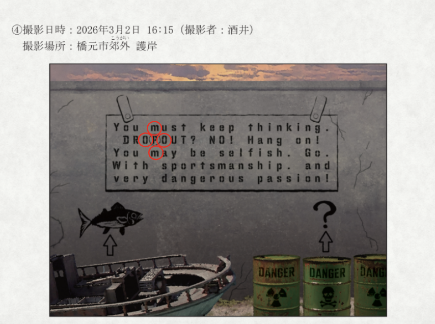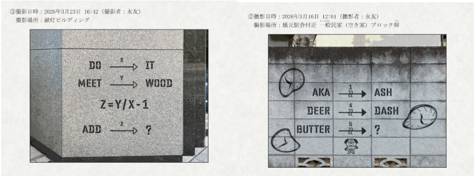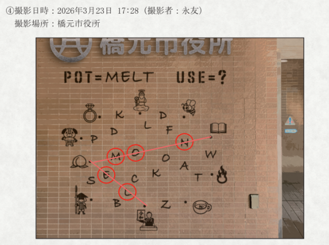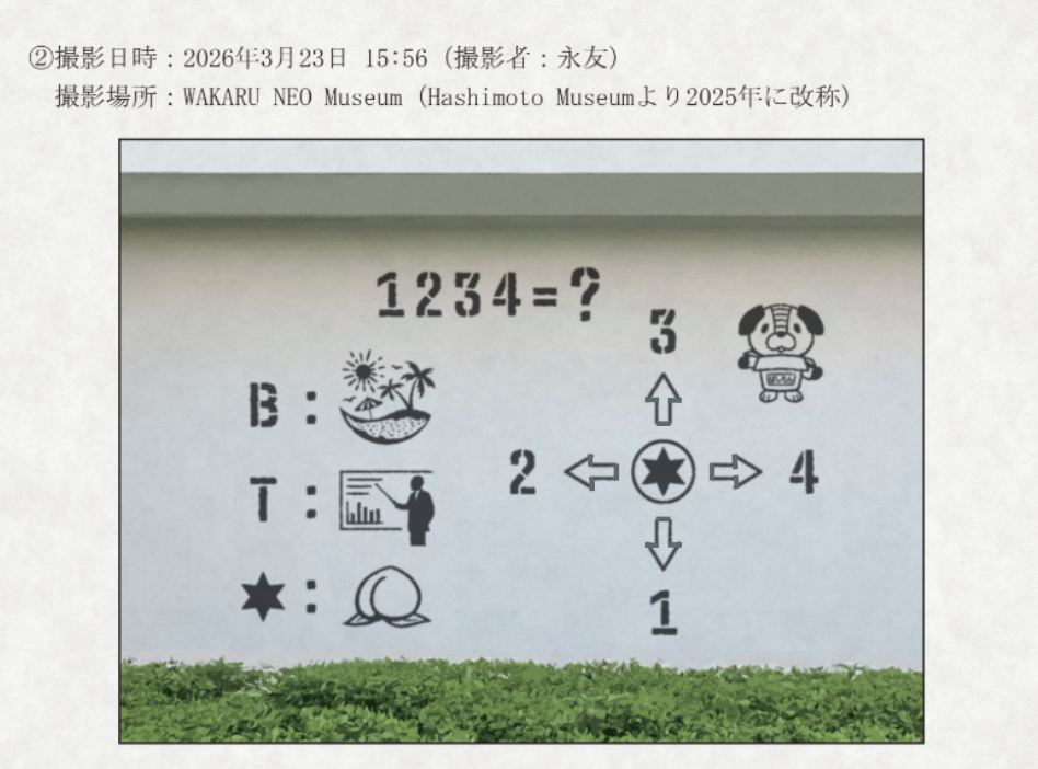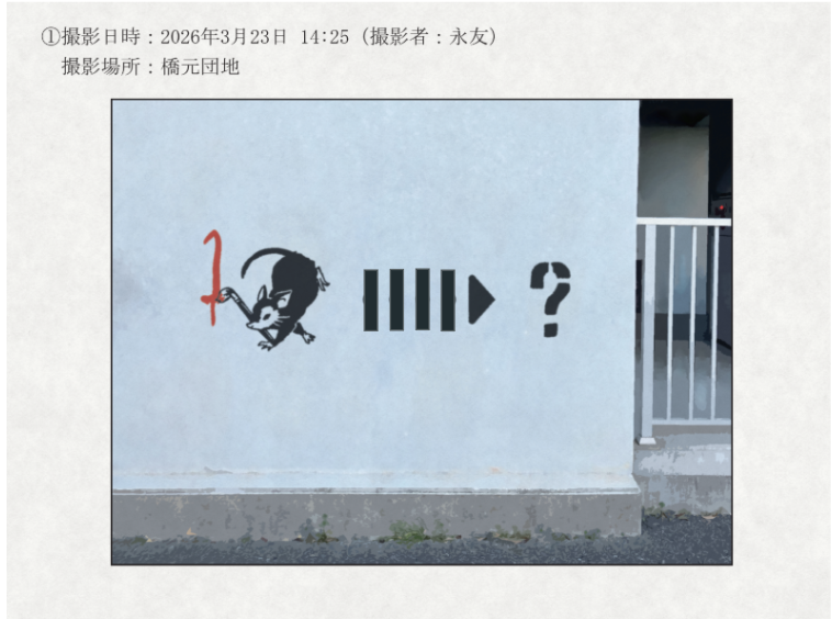 (封筒④『2026年3月23日 橋元市内 壁面汚損事案 状況資料』内の謎はいずれも、問題の矢印に手を加えるだけで、答えを変更することが出来るようです。変更後の答えを回答してください。)