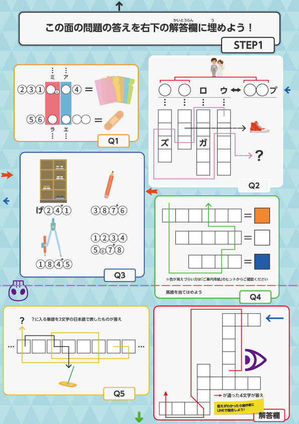 STEP1の問題は「この面の問題文の答えを右下の解答欄に埋めよう!」です。Q1~Q5ではなく「この面の問題」とするようなあいまいな表記や、解答欄の場所についての記載があるこの問題文を利用できないでしょうか。