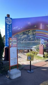 カメラマークの辺りに立って、透明シートに描かれた夕焼けを島に向けてかざして、写真を撮りましょう。