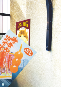 みかんアイスゼリーは、ライブのチラシの裏に載っています。猫のけん太のポスターが辻宗商店の入り口の左側に貼られています。けん太がアイスゼリーをくわえているような状態を作り、写真を撮りましょう。