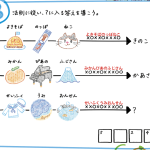 ⚪︎×の上に、イラストを表す単語を順に書き込んでみると、「⚪︎に対応する場所に書かれた文字を読むこと」が矢印の法則であることに気付きます。