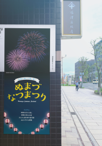 花火は沼津日和の表紙にあります。夏祭りのポスターは布澤呉服店のドアの近くの壁を探してみましょう。
