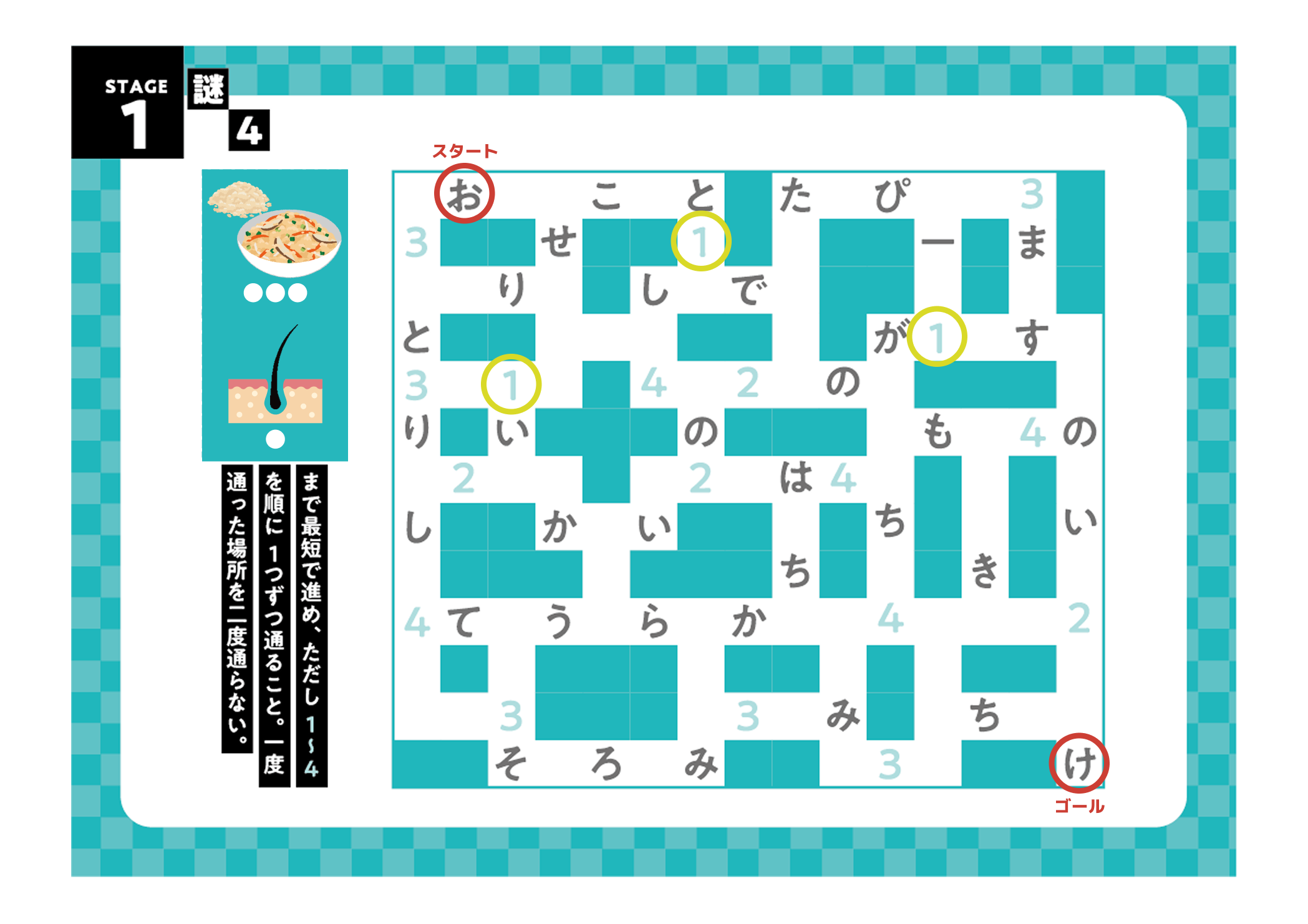 右2つの「1」は続く「2」「3」への道筋を考えた時、ゴールまでの道筋がなくなってしまうので除外すると左の「1」が最初に通過する「1」だとわかる。続く「2」は一通りしかないので、行き止まりにならないように線でつなげよう。あとは自分で考えよう。