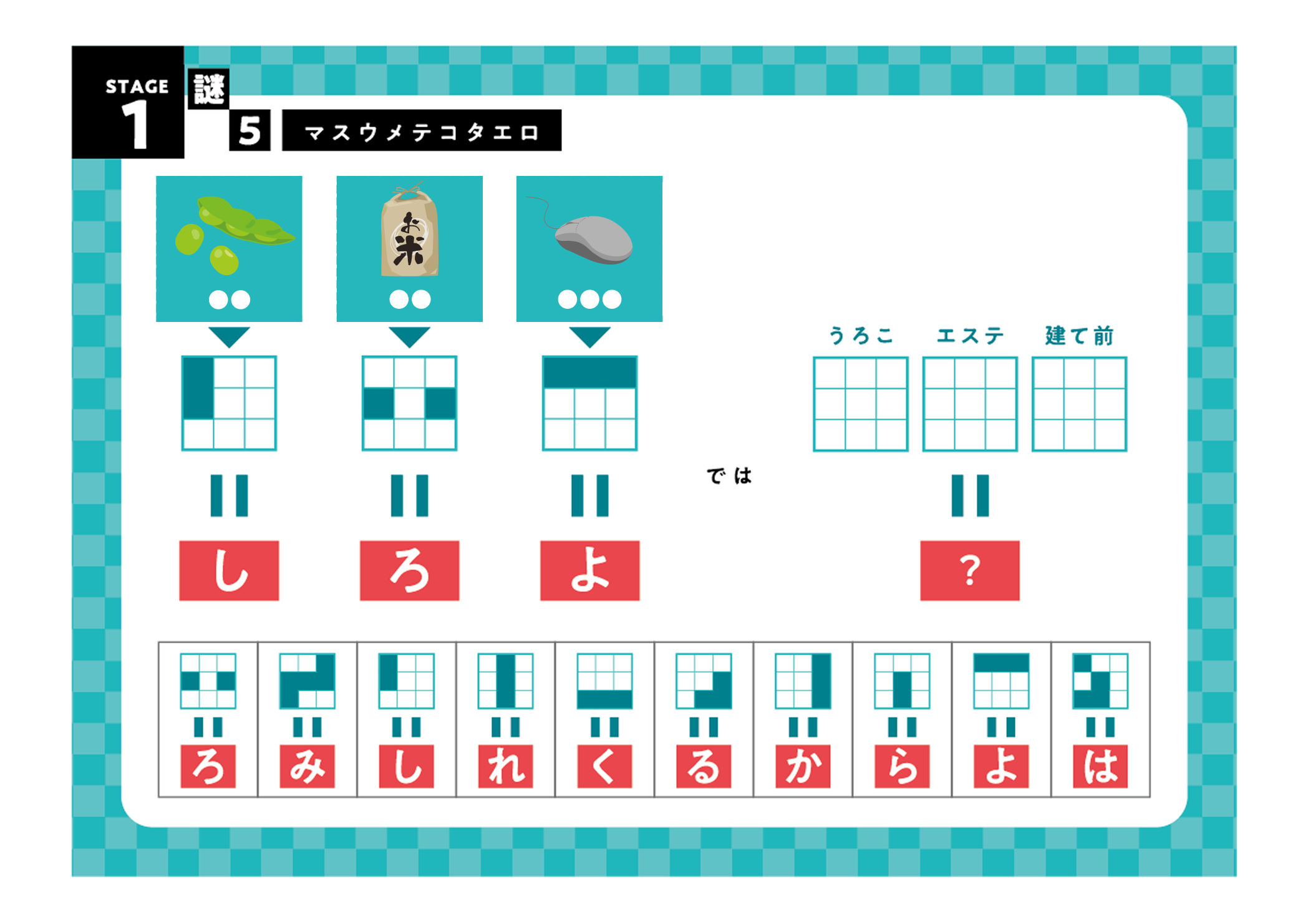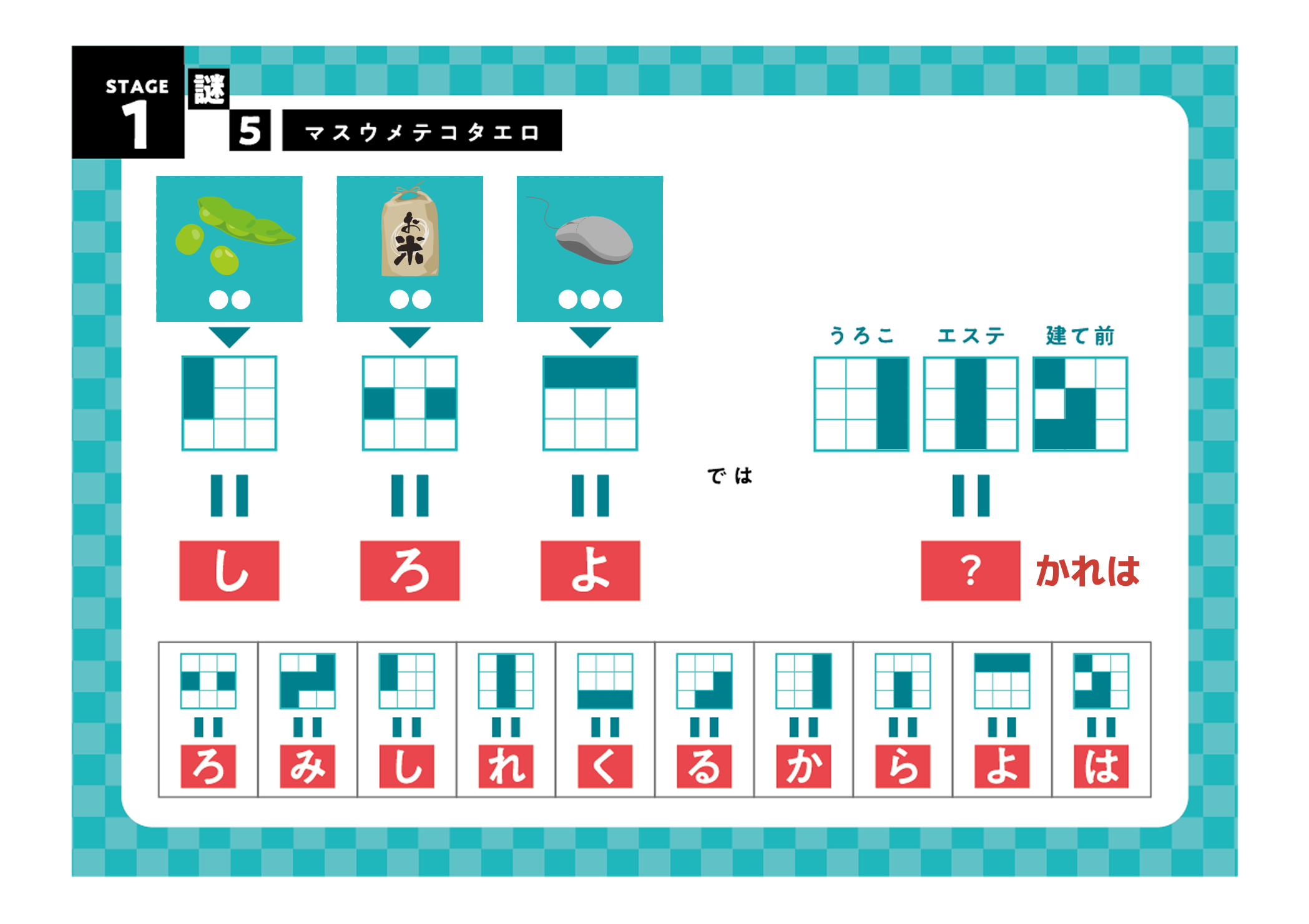 「マスウメテコタエロ」という文章を3×3の9マスに埋め、「ウロコ」「エステ」「タテマエ」に対応するマスを塗る。塗った後、それぞれ対応する模様を読むと「かれは」となる。