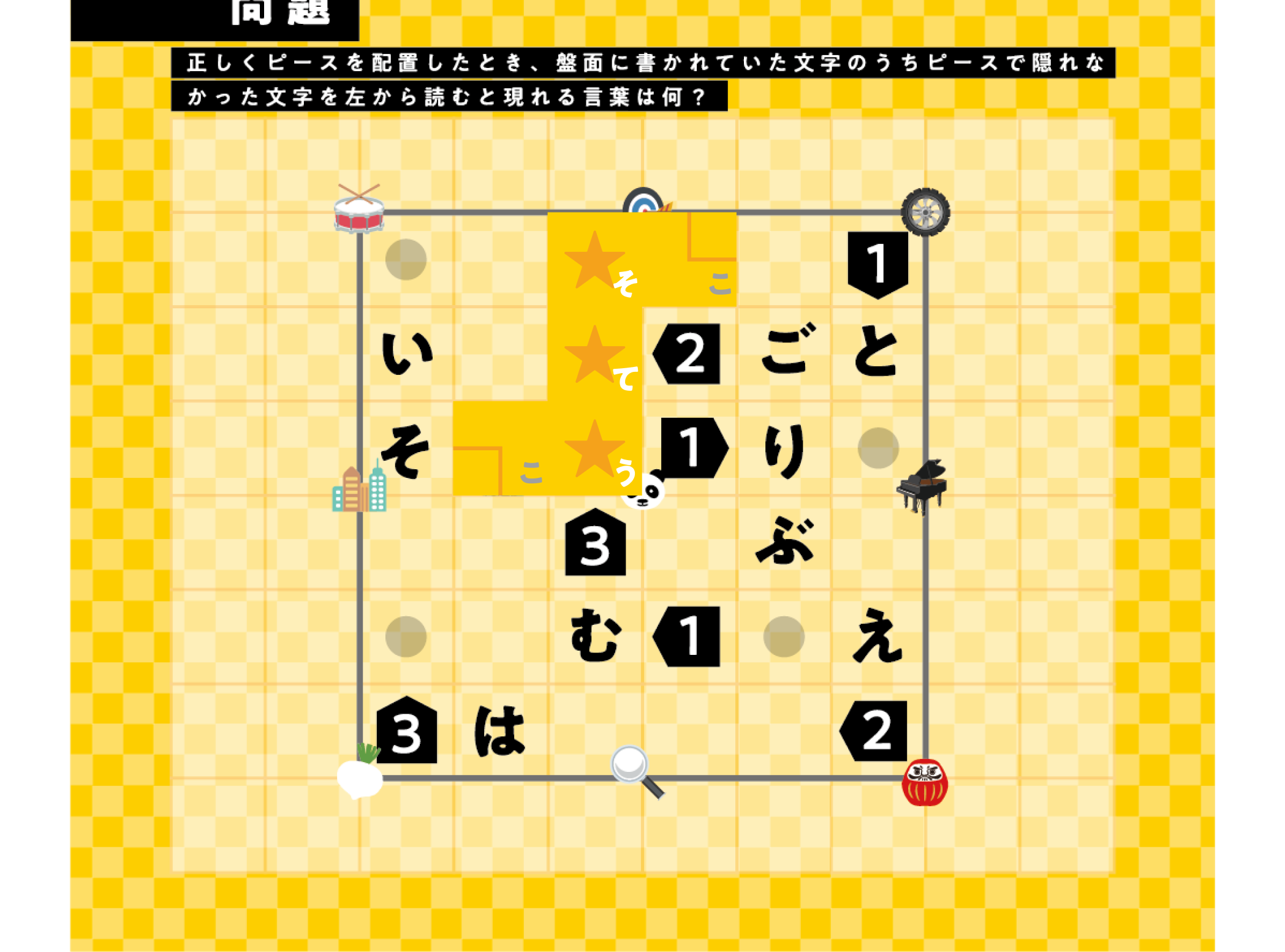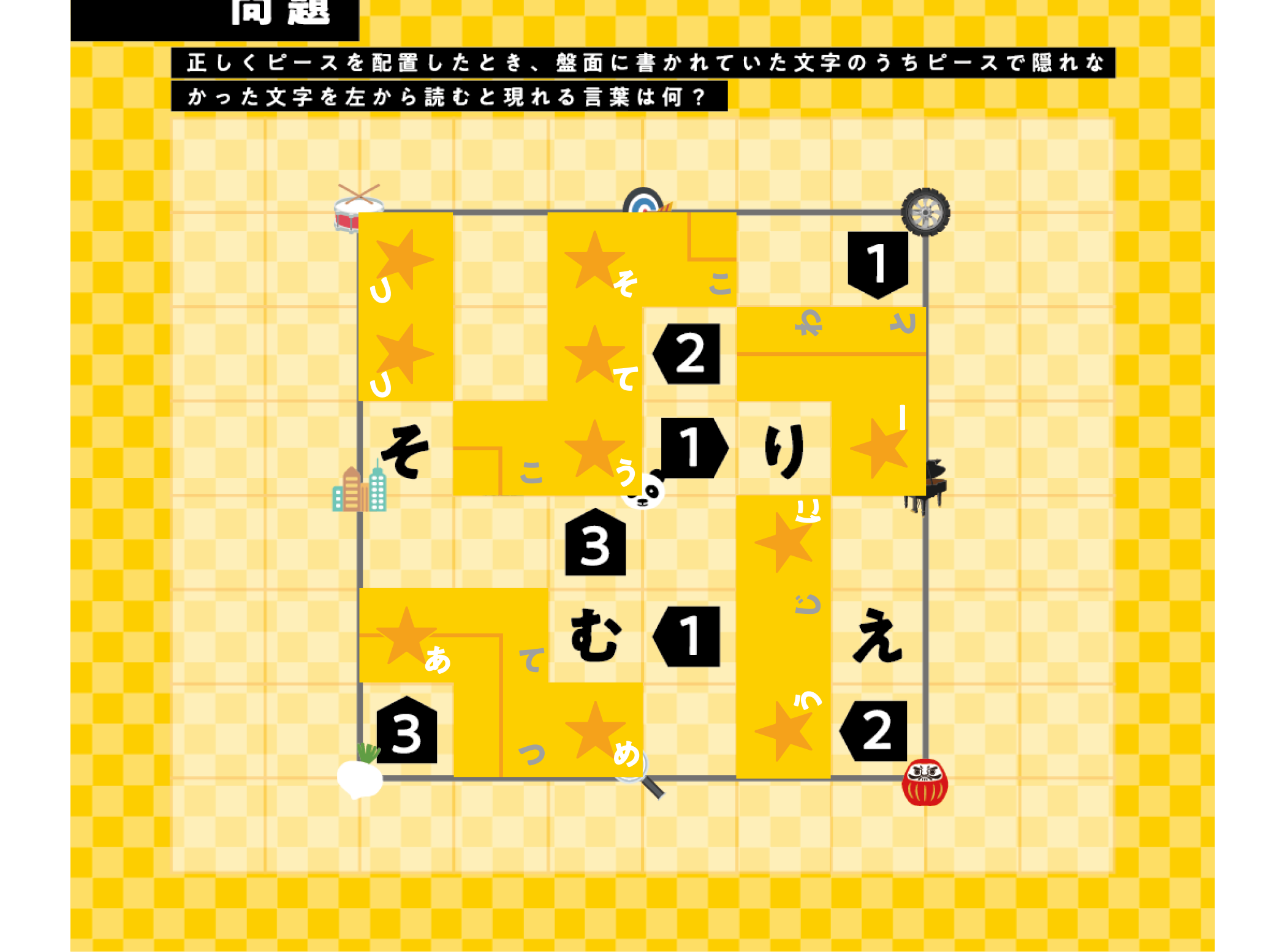 「3」と書かれた方向にはまっすぐ星が3つ並ぶが、ピースが隣接してはいけないルールがあるので、1つのピースで星が3つ並ぶような配置をしないといけない。指定されている星の情報と配置しているピースの位置関係をよく考えてピースを配置していこう。