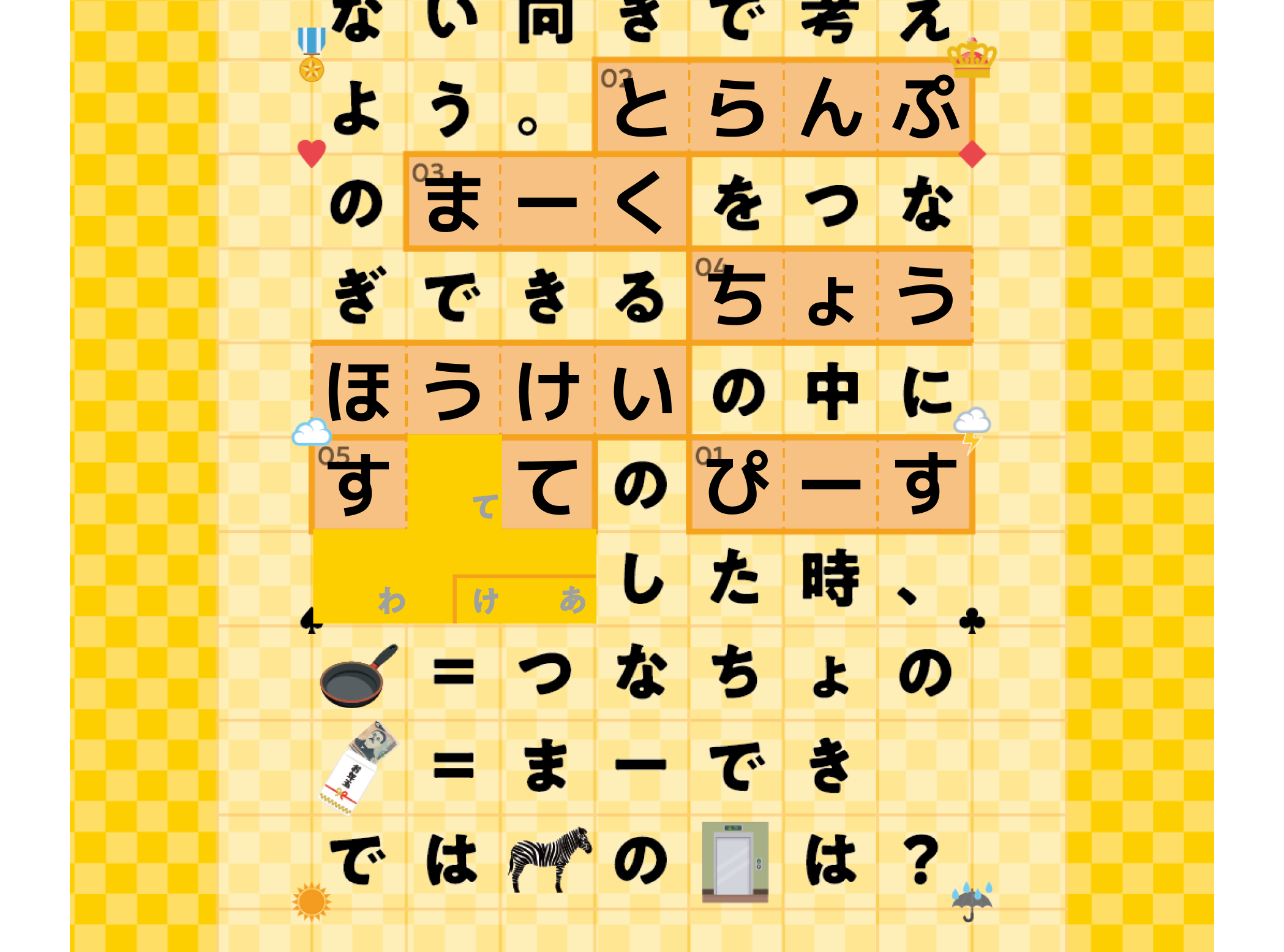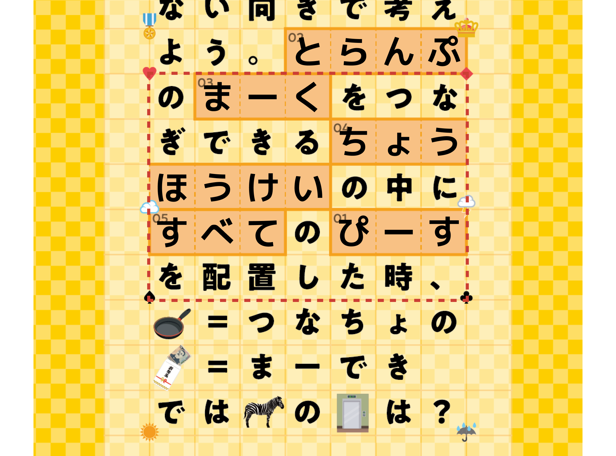 パズル1〜パズル5で得られたキーワードを埋めると、「ピースの文字の向きが回転したり逆さまにならない向きで考えよう。トランプのマークをつないでできる長方形の中にすべてのピースを配置した時…」