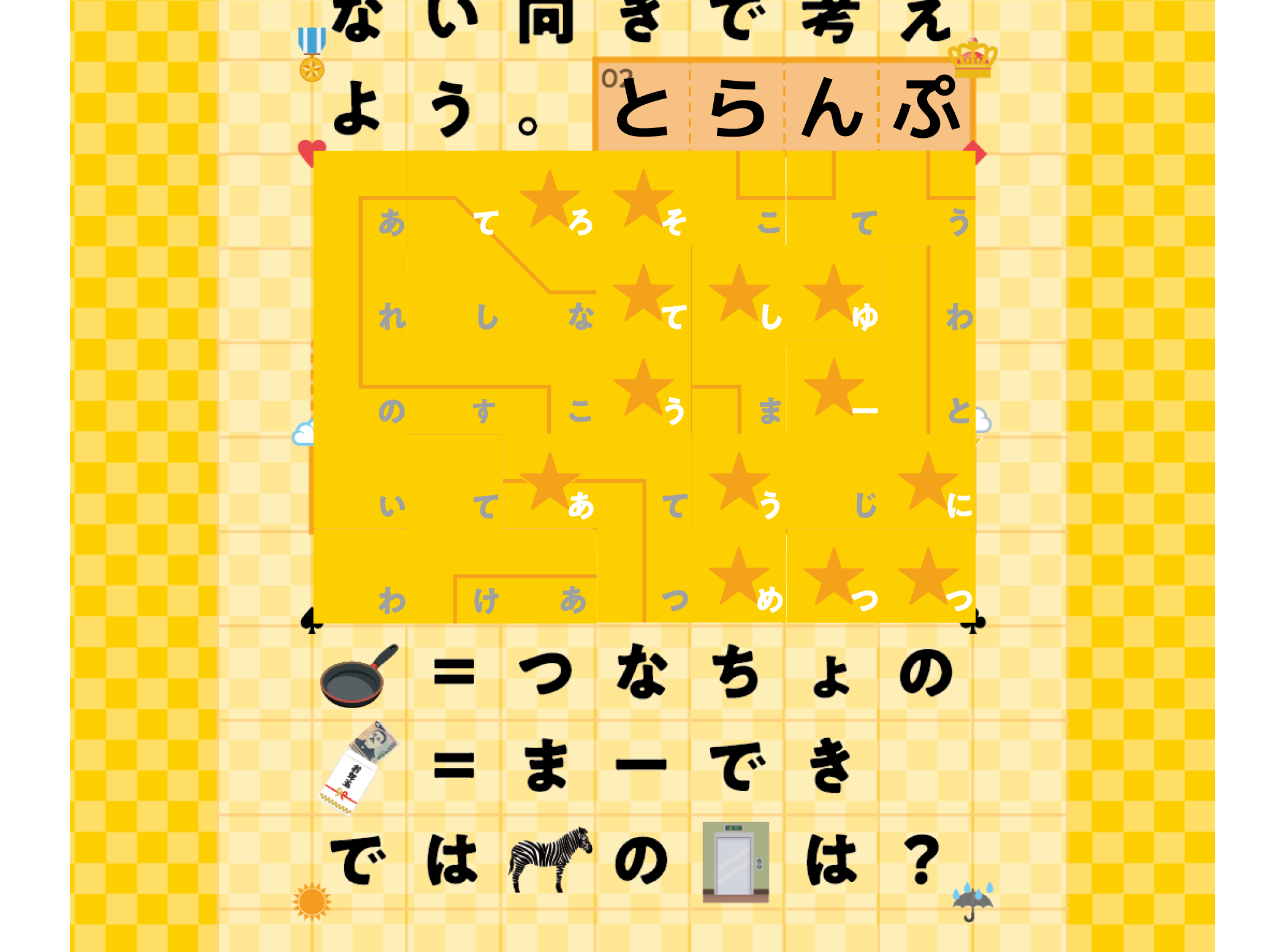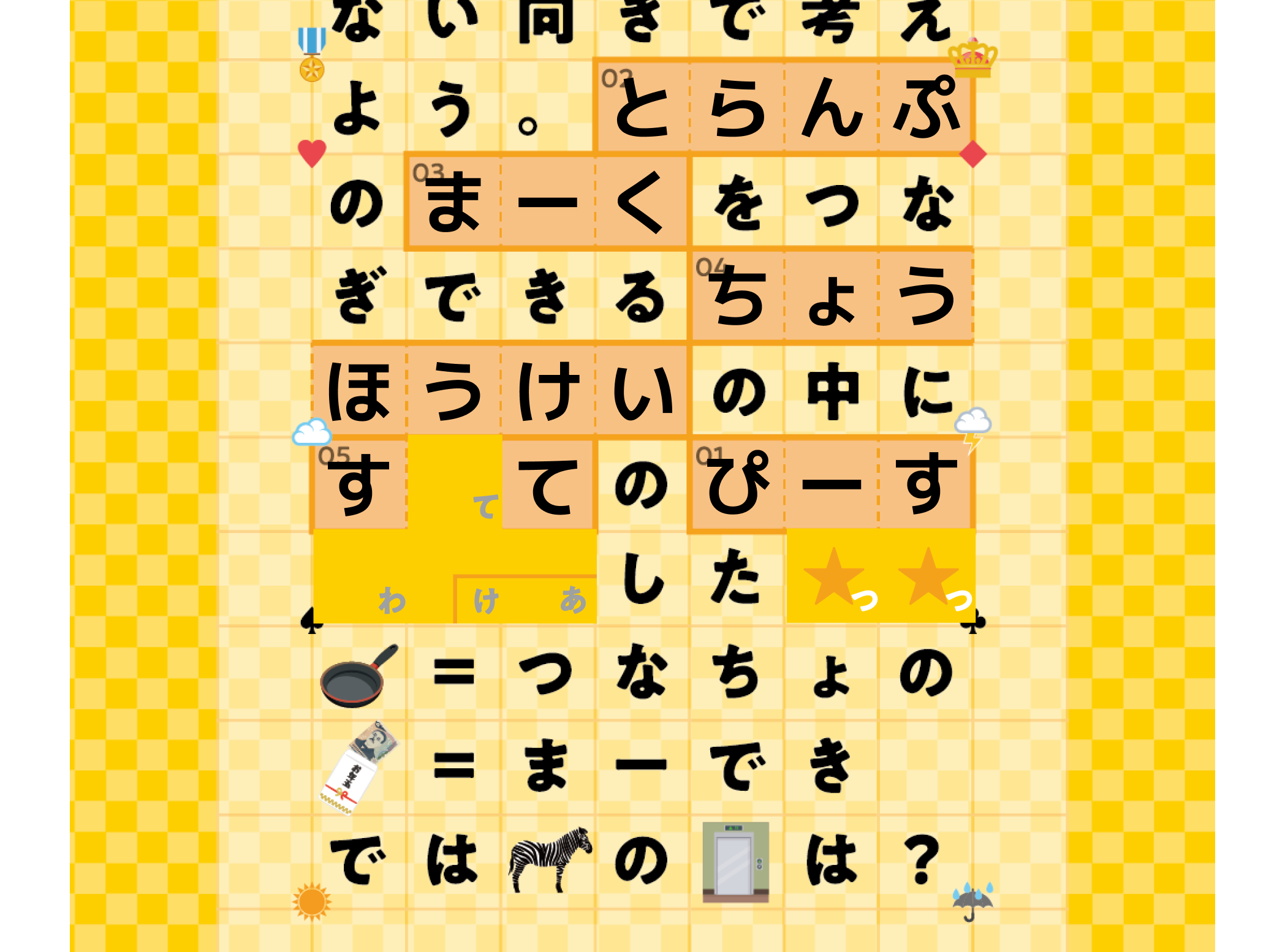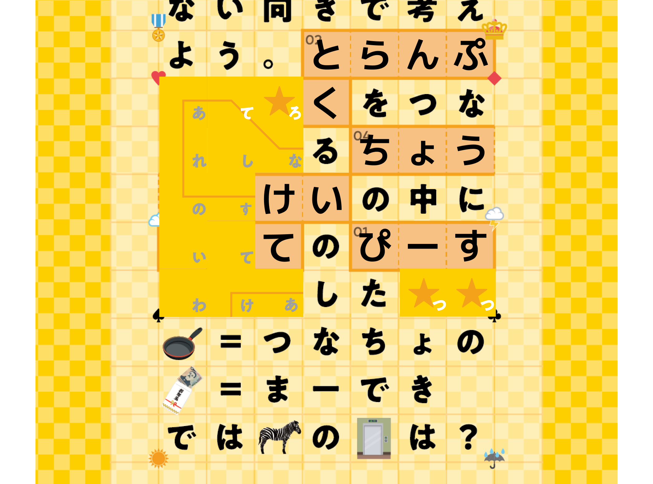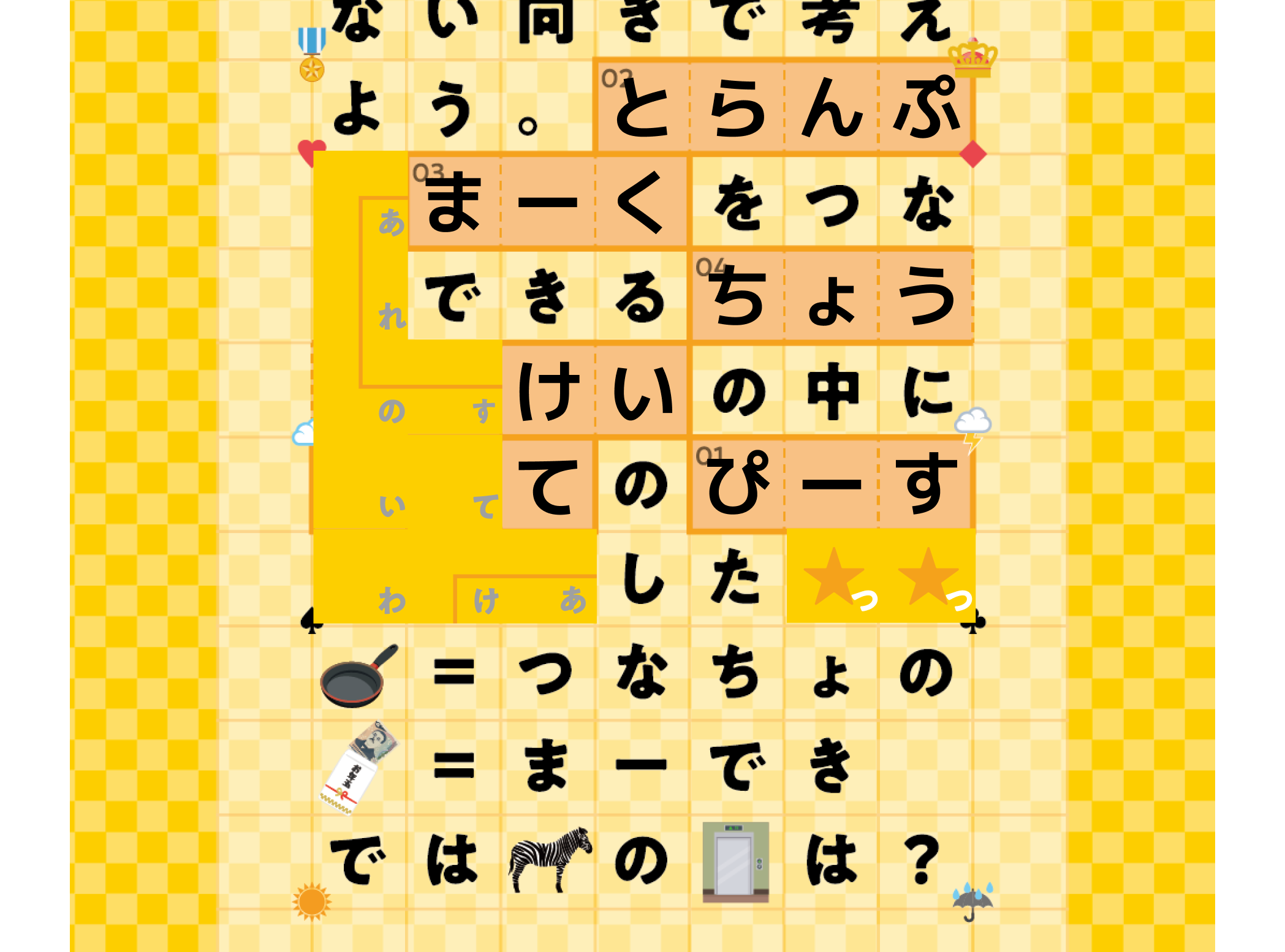 配置したピースの「て」の下を読むと「しゅうけつ」となる。