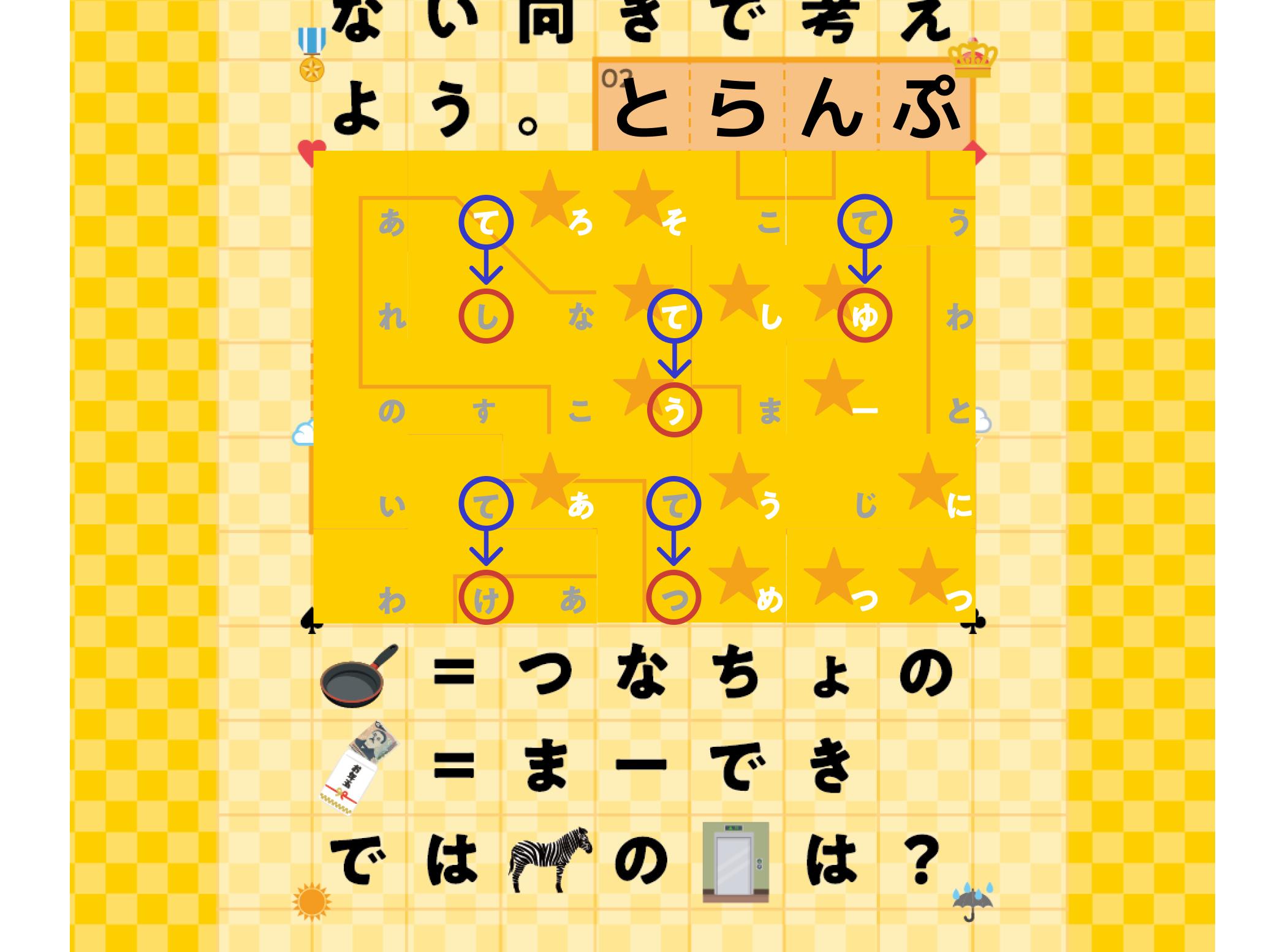 つまり、最後の行の「では”しまうま”の”エレベーター”は?」は「では”ピース”の”てのした”は?」となる。
