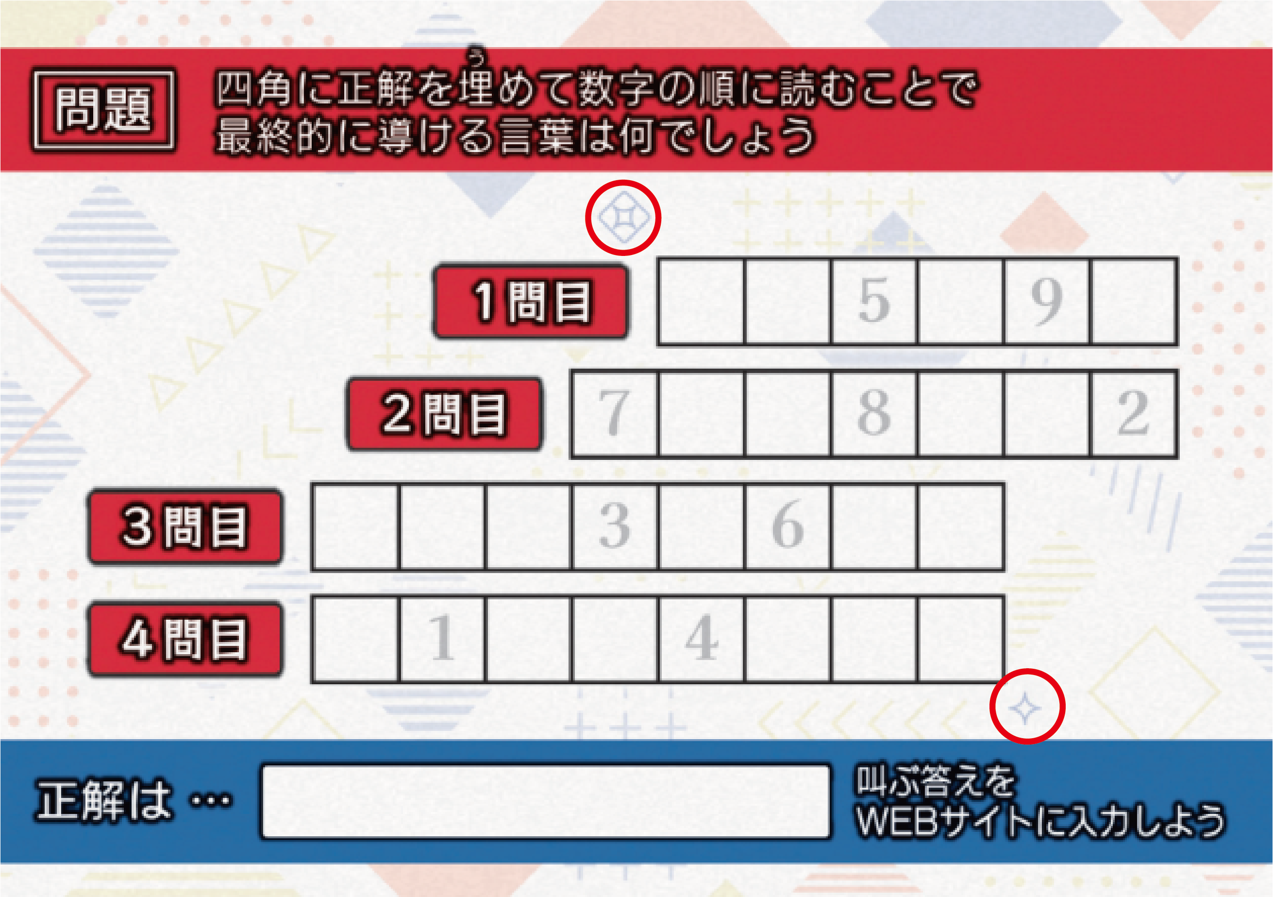1問目の法則を思い出し、その図形の間の文字を読んでみましょう。