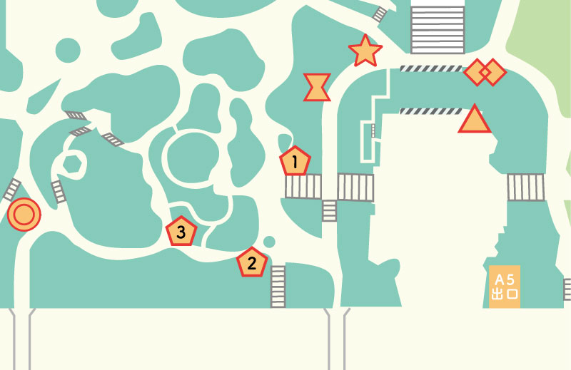 ◎の場所に行き、公園案内図を見つけたら、そばにある橋を渡ろう。橋を渡ったら、灰色のモニュメントの場所で斜め右に進もう。建物の入口の前まで来たら、入口に向かって左手にある公衆電話の方へ向かおう。公衆電話を通り過ぎ、突き当たりを右に曲がったら、まっすぐ進もう。しばらく進んで、左手に見える横断歩道を渡ったら、まっすぐ進み、赤いポストの隣のスロープを上り、建物の中に入ろう。建物に入ったら右手の通路を進んだ先にあるエレベーターで1階に降りよう。降りたら18PのSTEP1へ進もう。