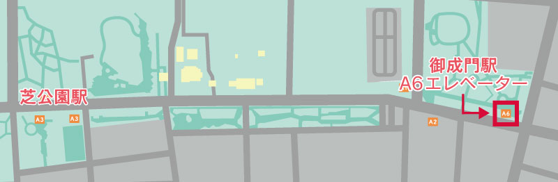 御成門駅に行く場合:地図のA6エレベーターに向かい、改札階行きエレベーターに乗ろう。エレベーターを降りたら目の前の改札には入らずに、ホーム階ゆきエレベーターの表示にしたがって進もう。改札に入ったらホーム階ゆきエレベーターに乗ろう。
