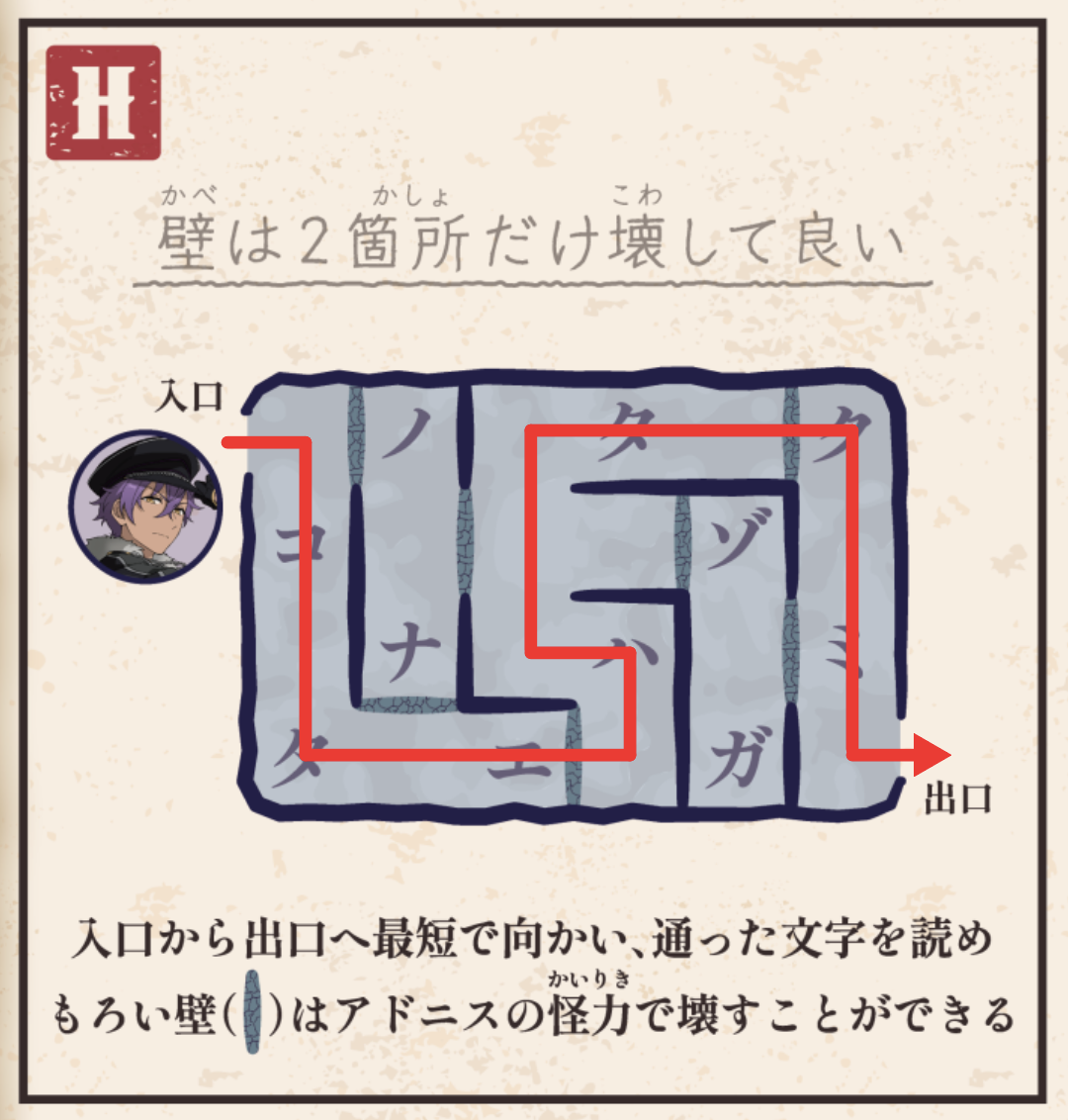 「ク」の左の壁を壊して出口へ向かいましょう。