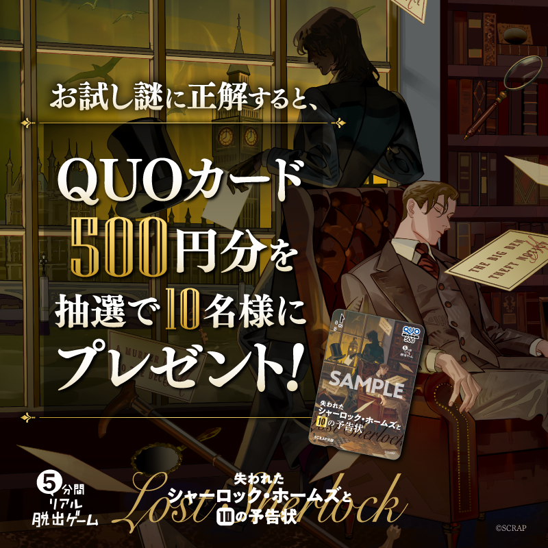 対象:全国のリアル脱出ゲーム店舗、または東京ミステリーサーカス、SCRAP GOODS SHOP(オンラインショップ)でご購入いただいた方