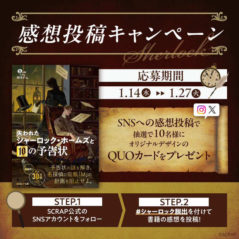②『5分間リアル脱出ゲーム 失われたシャーロック・ホームズと10の予告状』の感想を「#シャーロック脱出」のハッシュタグを付けて、キャンペーン期間内にInstagramまたはXに投稿