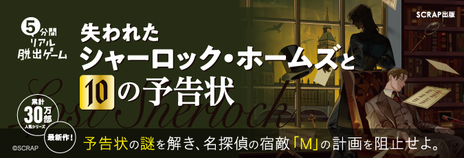 累計発行部数30万部突破の人気シリーズ「5分間リアル脱出ゲーム」シリーズ最新作となる『5分間リアル脱出ゲーム 失われたシャーロック・ホームズと10の予告状』は、偉大な名探偵シャーロック・ホームズが失踪し混乱の極みにある19世紀末のロンドンを舞台に、読者がロンドン警視庁の新人刑事になって犯行予告状の謎を解き、事件解決を目指す謎解き本です。