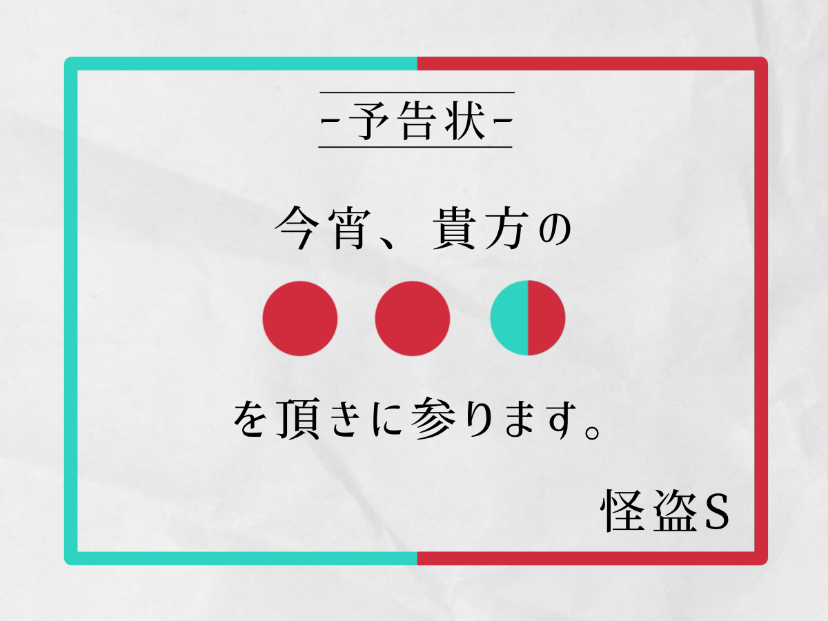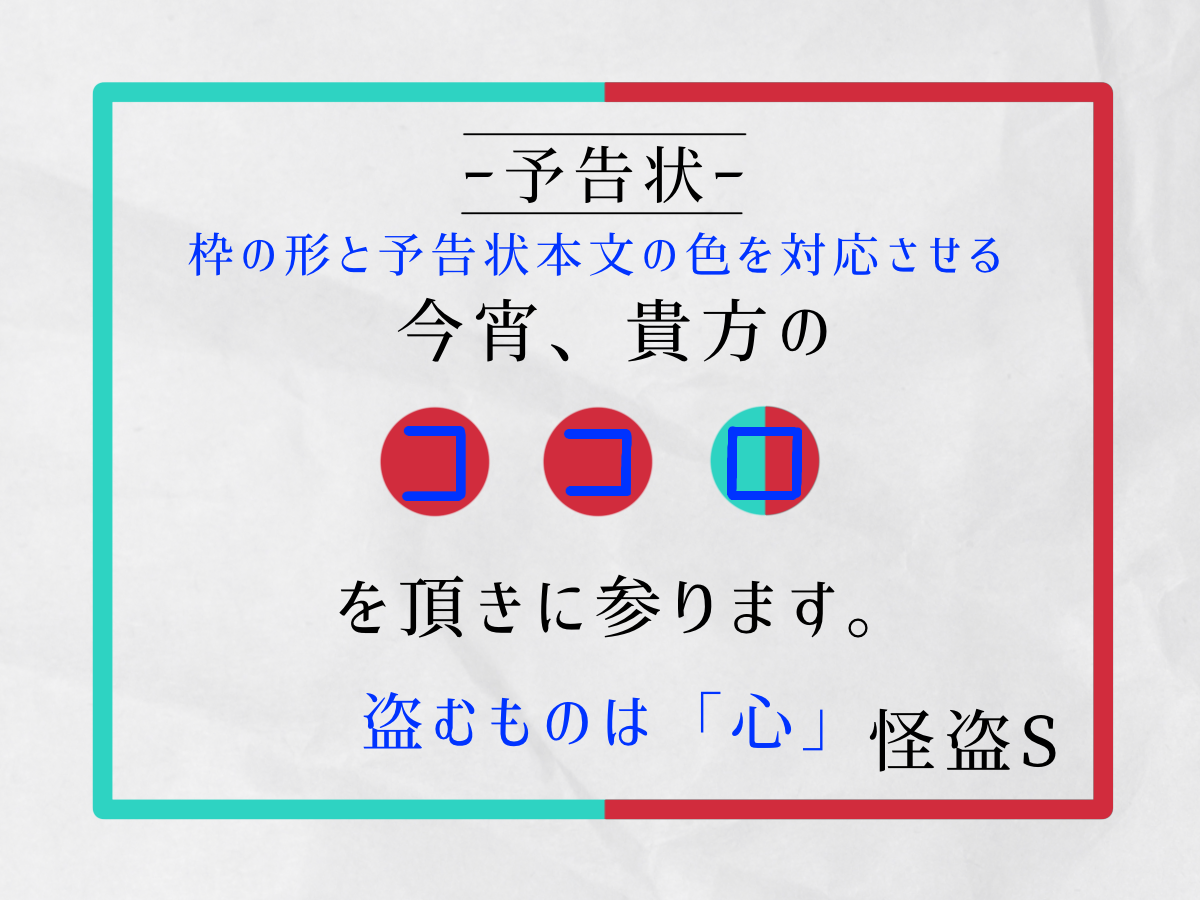 「心を盗む」というのは王道中の王道なのですが、それが予告状で届くということは、それってつまりラブレターだよね!と解釈し、スタッフ一同勝手に盛り上がっていました(笑)。謎もちょっとした閃きで解けるところが程良くてきれいで、総合的に良い予告状だと思い、選ばせていただきました。
