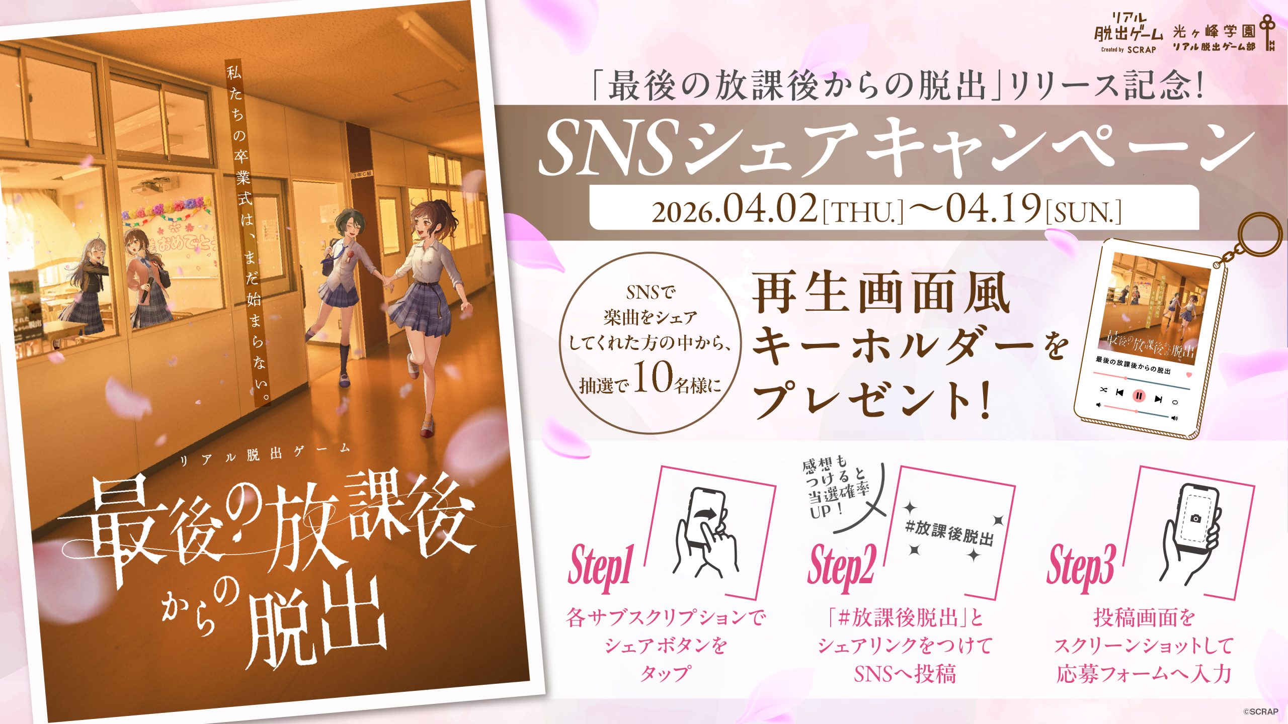 「最後の放課後からの脱出」を聞いて、各サブスクリプションのシェアリンクと「#放課後脱出」をつけてSNSへ投稿して応募すると、抽選で10名様にここでしか手に入らない「再生画面風キーホルダー」をプレゼントいたします!