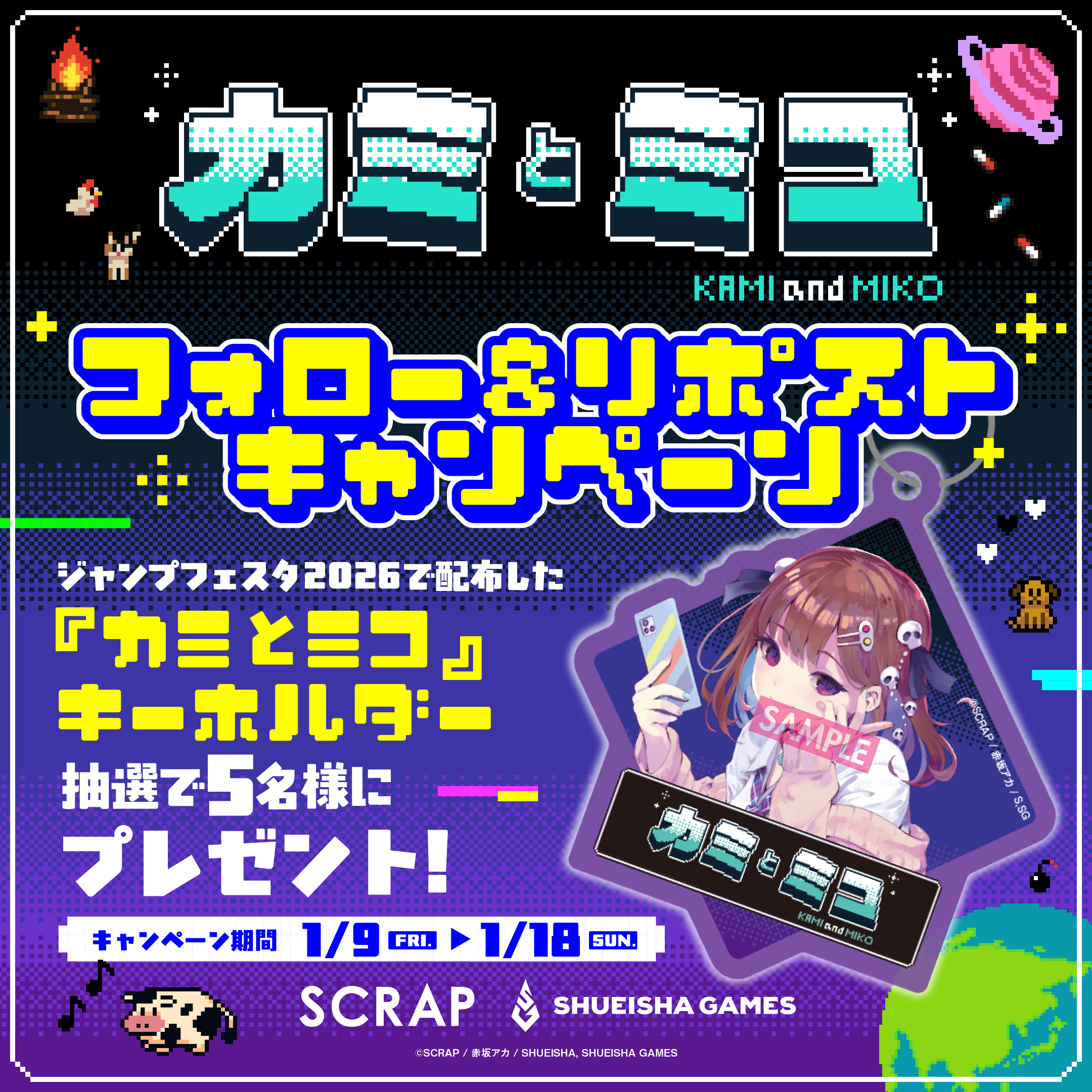 本キャンペーンでは、ジャンプフェスタ2026 集英社ゲームズブースにて配布していた『カミとミコ』オリジナルキーホルダーを、フォロー&リポストキャンペーンにご参加いただいた方の中から抽選で5名様にプレゼントします。